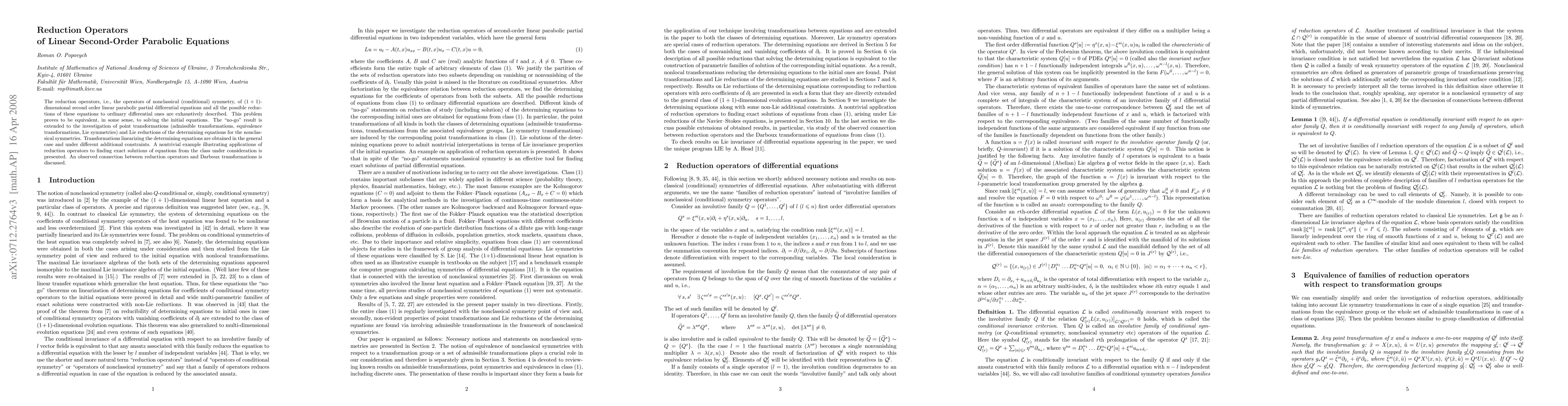 This paper thoroughly explores the reduction operators for (1+1)-dimensional linear second-order parabolic PDEs, detailing their equivalence to solving the initial equations and presenting transformations that linearize determining equations. It also discusses connections between reduction operators and Darboux transformations, with a nontrivial example demonstrating their application.