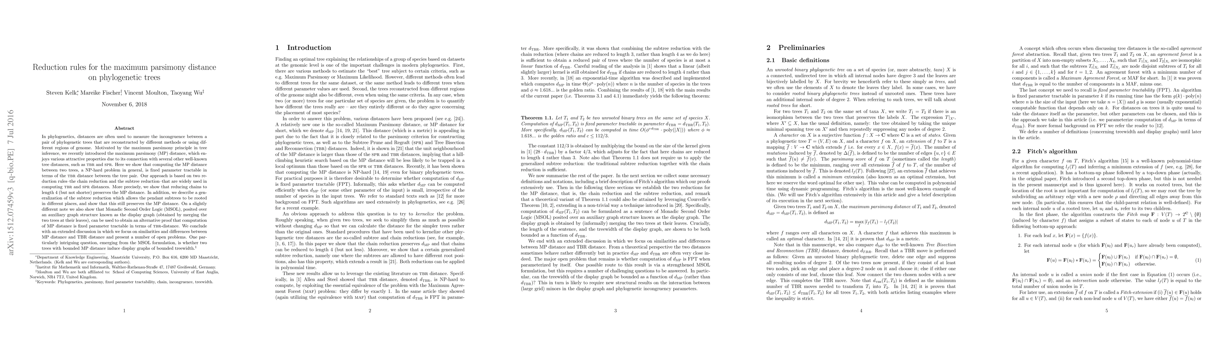 This paper introduces the maximum parsimony (MP) distance for phylogenetic trees, demonstrating that computing this distance is fixed parameter tractable concerning the TBR distance. It utilizes reduction rules, such as chain reduction and generalized subtree reduction, to simplify the computation while preserving the MP distance. The study also explores the use of Monadic Second Order Logic (MSOL) over the display graph for an alternative proof and discusses potential open problems, including the relationship between MP distance and treewidth.