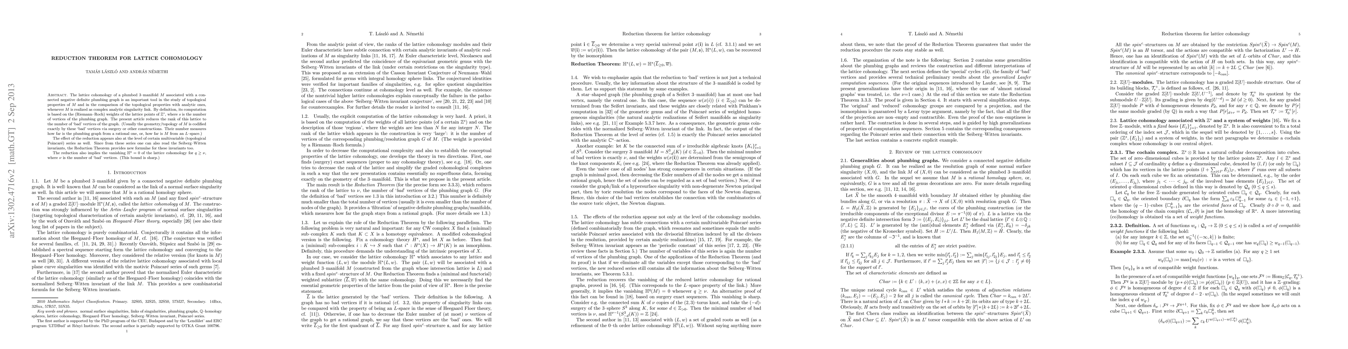 This paper proves a reduction theorem for lattice cohomology of plumbed 3-manifolds, reducing the rank of the lattice to the number of 'bad' vertices in the plumbing graph, which affects topological properties and Seiberg-Witten invariants.