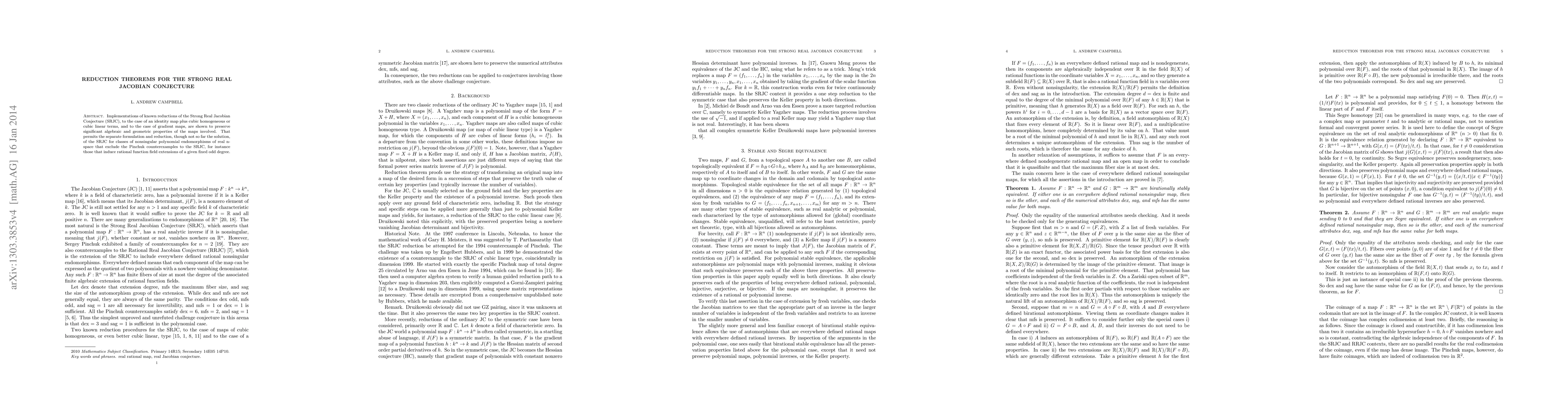 Implementations of known reductions of the Strong Real Jacobian Conjecture (SRJC), to the case of an identity map plus cubic homogeneous or cubic linear terms, and to the case of gradient maps, are shown to preserve significant algebraic and geometric properties of the maps involved. That permits the separate formulation and reduction, though not so far the solution, of the SRJC for classes of nonsingular polynomial endomorphisms of real n-space that exclude the Pinchuk counterexamples to the SRJC, for instance those that induce rational function field extensions of a given fixed odd degree.