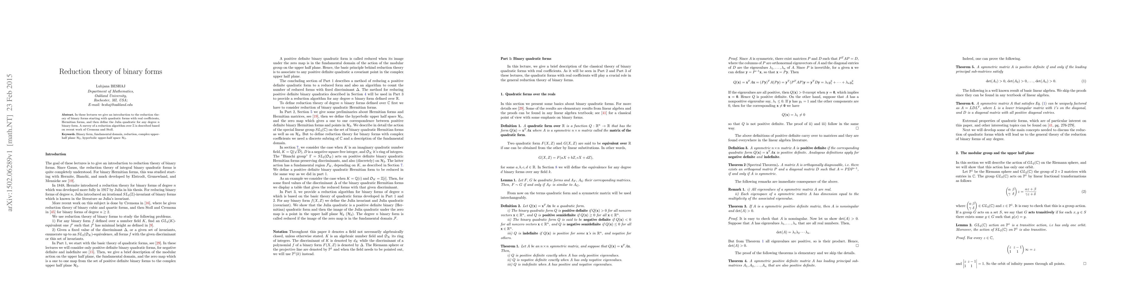 In these lectures we give an introduction to the reduction theory of binary forms starting with quadratic forms with real coefficients, Hermitian forms, and then define the Julia quadratic for any degree $n$ binary form. A survey of a reduction algorithm over $\mathbb Z$ is described based on recent work of Cremona and Stoll.