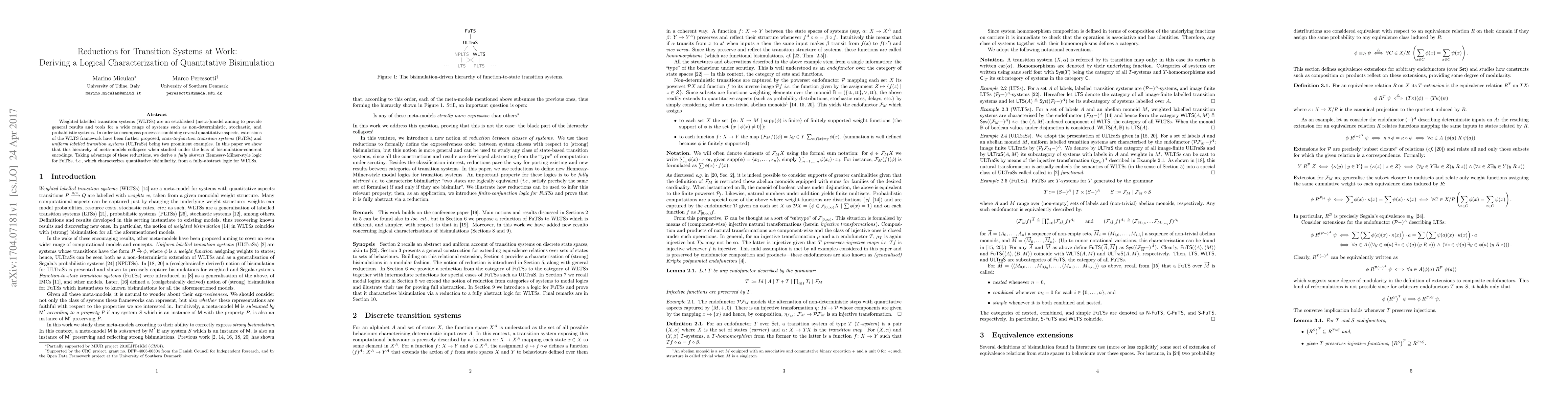 Weighted labelled transition systems (WLTSs) are an established meta-model aiming to provide general results and tools for a wide range of systems such as non-deterministic, stochastic, and probabilistic systems. In order to encompass processes combining several quantitative aspects, extensions of the WLTS framework have been further proposed, state-to-function transition systems (FuTSs) and uniform labelled transition systems (ULTraSs) being two prominent examples. In this paper we show that this hierarchy of meta-models collapses when studied under the lens of bisimulation-coherent encodings. Taking advantage of these reductions, we derive a fully abstract Hennessy-Milner-style logic for FuTSs, i.e., which characterizes quantitative bisimilarity, from a fully-abstract logic for WLTSs.