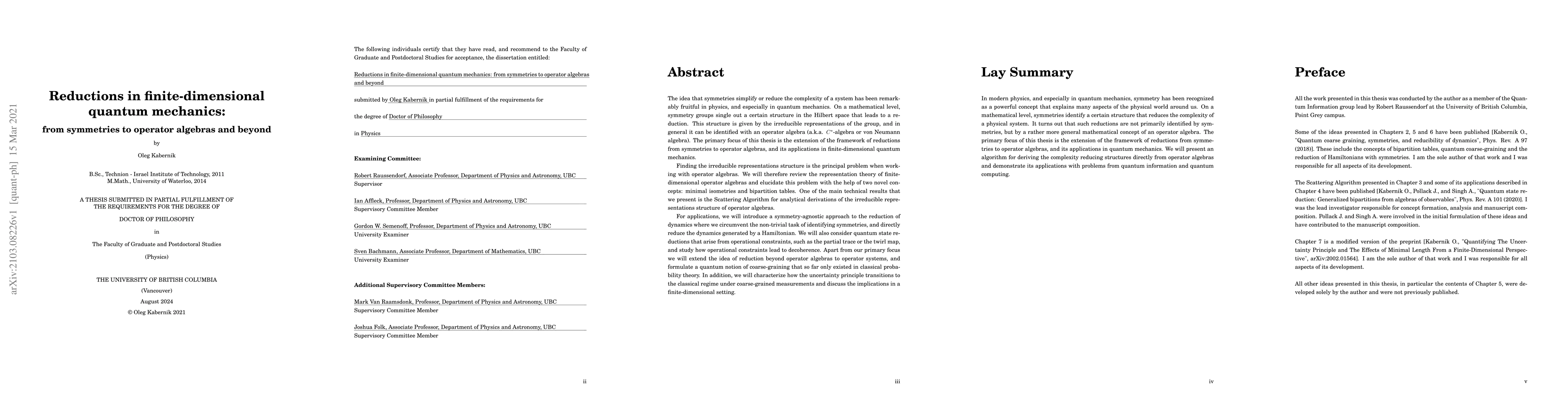 The idea that symmetries simplify or reduce the complexity of a system has been remarkably fruitful in physics, and especially in quantum mechanics. On a mathematical level, symmetry groups single out a certain structure in the Hilbert space that leads to a reduction. This structure is given by the irreducible representations of the group, and in general it can be identified with an operator algebra (a.k.a. C*-algebra or von Neumann algebra). The primary focus of this thesis is the extension of the framework of reductions from symmetries to operator algebras, and its applications in finite-dimensional quantum mechanics. Finding the irreducible representations structure is the principal problem when working with operator algebras. We will therefore review the representation theory of finite-dimensional operator algebras and elucidate this problem with the help of two novel concepts: minimal isometries and bipartition tables. One of the main technical results that we present is the Scattering Algorithm for analytical derivations of the irreducible representations structure of operator algebras. For applications, we will introduce a symmetry-agnostic approach to the reduction of dynamics where we circumvent the non-trivial task of identifying symmetries, and directly reduce the dynamics generated by a Hamiltonian. We will also consider quantum state reductions that arise from operational constraints, such as the partial trace or the twirl map, and study how operational constraints lead to decoherence. Apart from that, we will extend the idea of reduction beyond operator algebras to operator systems, and formulate a quantum notion of coarse-graining that so far only existed in classical probability theory. We will also characterize how the uncertainty principle transitions to the classical regime under coarse-grained measurements and discuss the implications in a finite-dimensional setting.