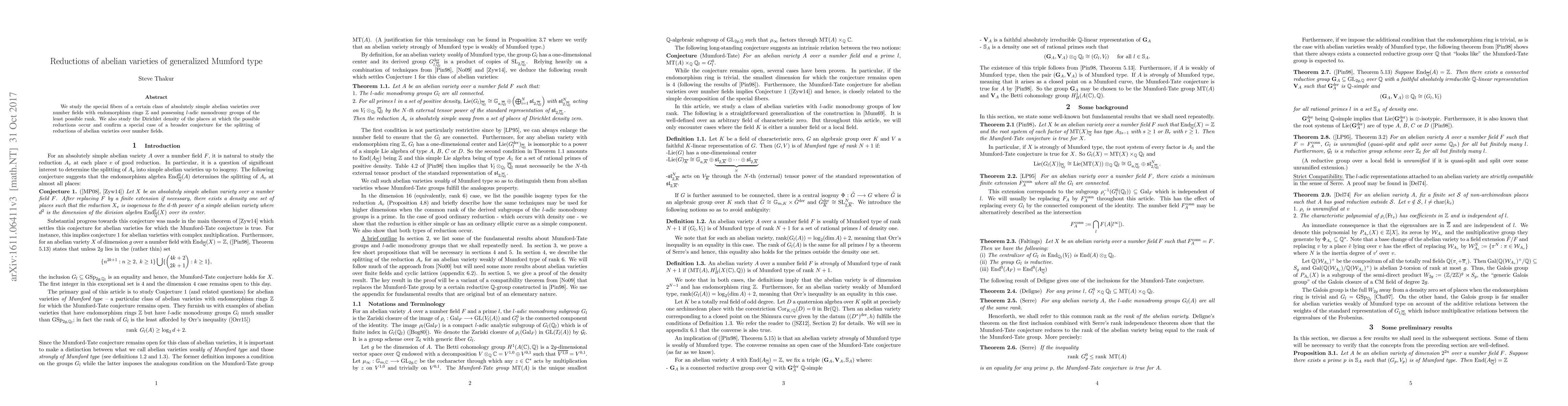 We study the special fibers of a certain class of absolutely simple abelian varieties over number fields with endomorphism rings $\bz$ and possessing $l$-adic monodromy groups of the least possible rank. We also study the Dirichlet density of the places at which the possible reductions occur and confirm a special case of a broader conjecture for the splitting of reductions of abelian varieties over number fields.
