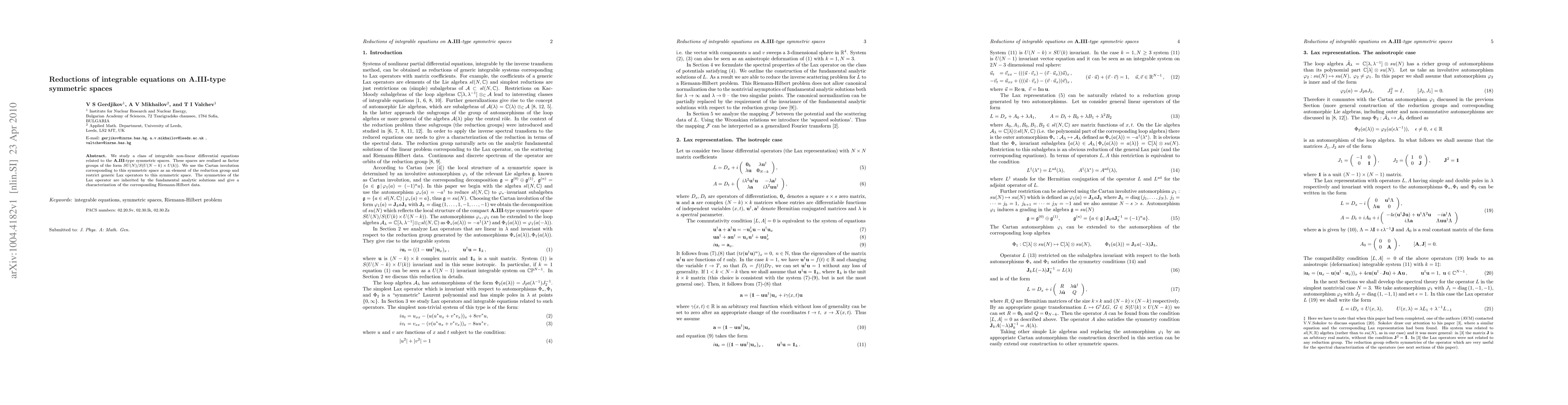 This paper investigates integrable non-linear differential equations associated with A.III-type symmetric spaces, realized as SU(N)/S(U(N-k) x U(k)) factor groups. It employs the Cartan involution to reduce generic Lax operators, linking symmetries of the Lax operator to the Riemann-Hilbert data of the fundamental solutions.