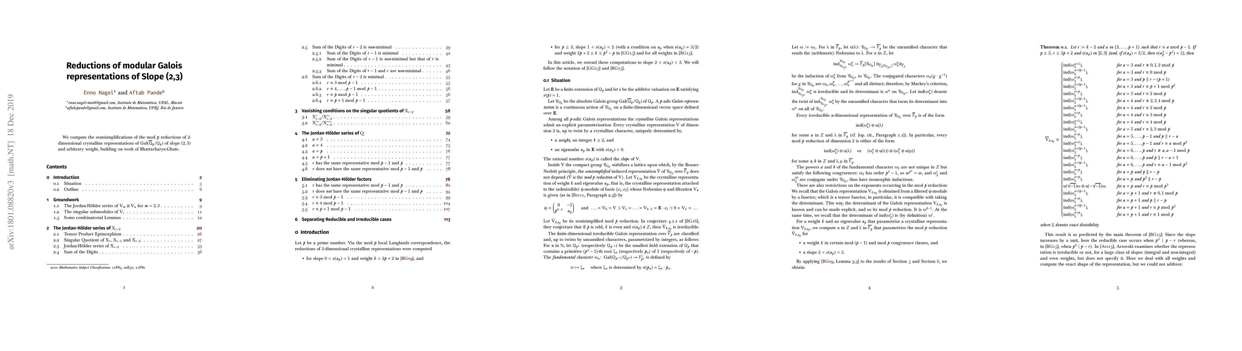 This paper computes the semisimplifications of mod-$p$ reductions for 2-dimensional crystalline Galois representations of slope $(2,3)$, extending previous work by Bhattacharya and Ghate. The results provide insights into the structure of these representations.