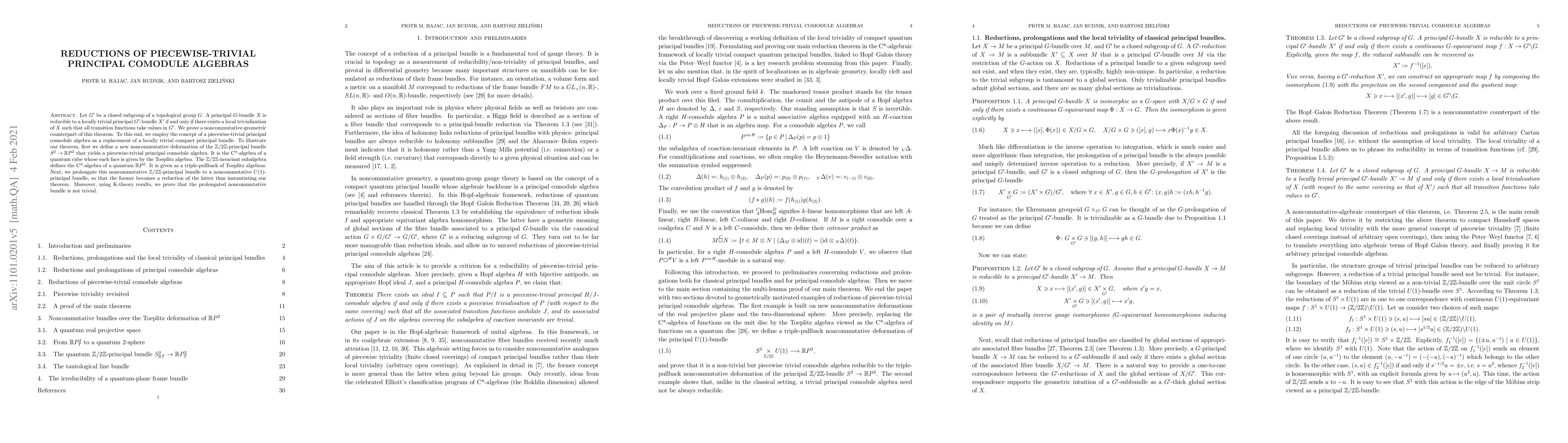 This paper proves a noncommutative geometric theorem analogous to the classical result about reducibility of principal bundles. It introduces piecewise-trivial principal comodule algebras as noncommutative analogs of locally trivial bundles and demonstrates the theorem using a noncommutative deformation of a $\mathbb{Z}/2\mathbb{Z}$-principal bundle, showing it is a reduction of a noncommutative $U(1)$-bundle.
