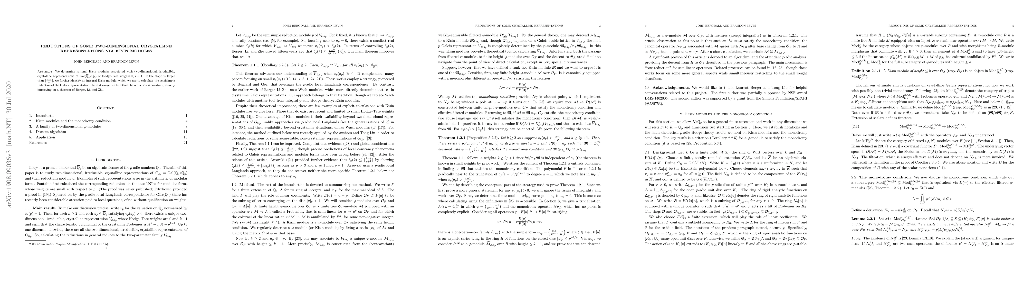 We determine rational Kisin modules associated with two-dimensional, irreducible, crystalline representations of $\mathrm{Gal}(\overline{\mathbb{Q}}_p/\mathbb{Q}_p)$ of Hodge-Tate weights $0, k-1$. If the slope is larger than $\lfloor \frac{k-1}{p} \rfloor$, we further identify an integral Kisin module, which we use to calculate the semisimple reduction of the Galois representation. In that range, we find that the reduction is constant, thereby improving on a theorem of Berger, Li, and Zhu.