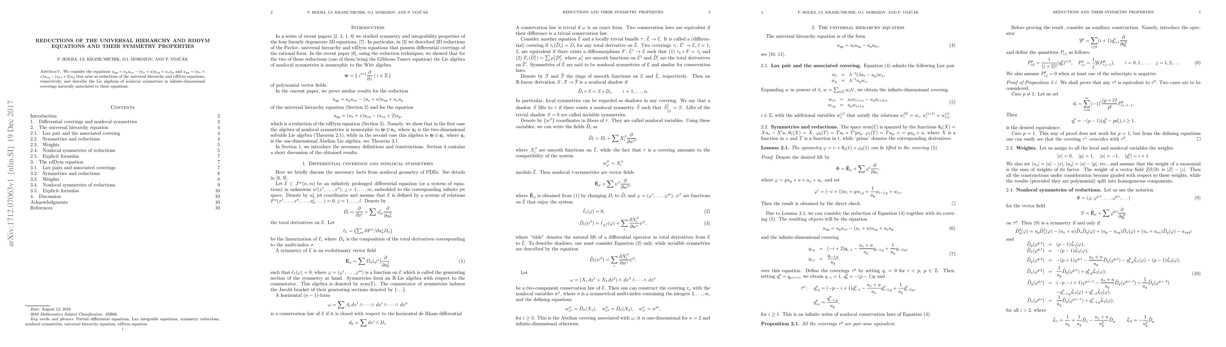 We consider the equations $u_{yy} = u_y u_{xx} - (u_x + u)u_{xy} + u_x u_y$ and $u_{yy} = (u_x + x)u_{xy} - (u_{xx} + 2)u_y$ that arise as reductions of the universal hierarchy and rdDym equations, respectively, and describe the Lie algebras of nonlocal symmetries in infinite-dimensional coverings naturally associated to these equations.