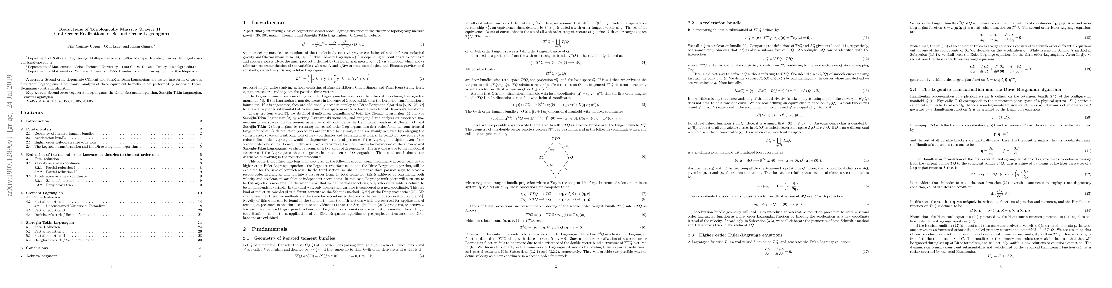 This paper recasts second order topologically massive gravity Lagrangians into first order forms using Dirac-Bergmann constraints, facilitating a Hamiltonian analysis of these equivalent formulations. The study employs the Cl\`ement and Sar{\i}o\u{g}lu-Tekin degenerate Lagrangians for this transformation.