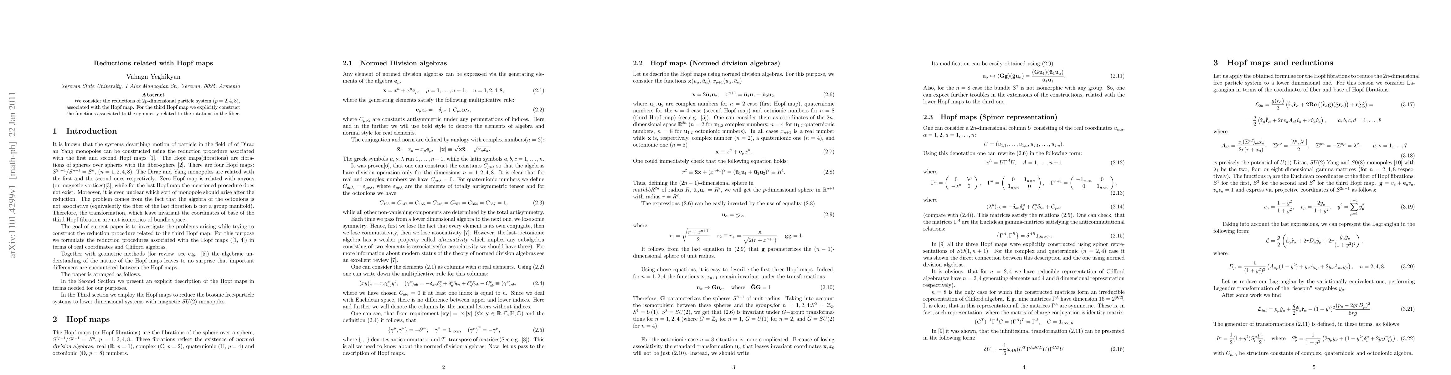 We consider the reductions of $2p$-dimensional particle system ($p=2,4,8$), associated with the Hopf map. For the third Hopf map we explicitly construct the functions associated to the symmetry related to the rotations in the fiber.