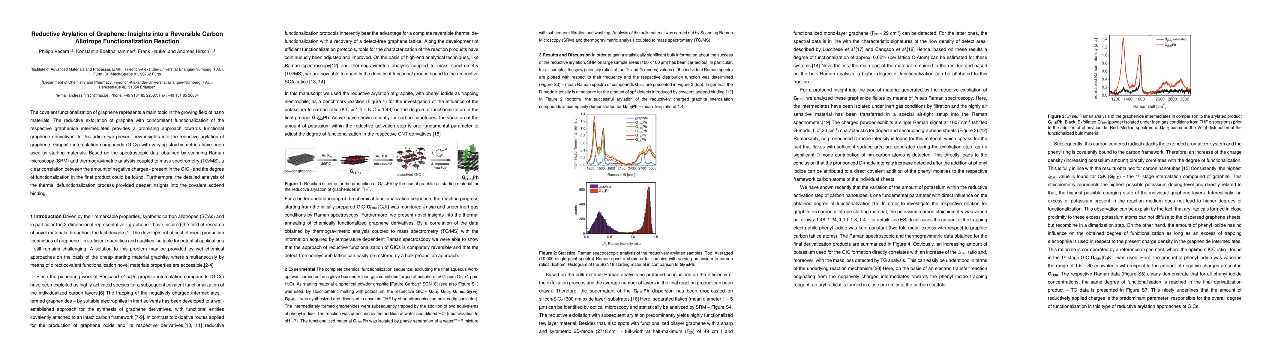 The covalent functionalization of graphene represents a main topic in the growing field of nano materials. The reductive exfoliation of graphite with concomitant functionalization of the respective graphenide intermediates provides a promising approach towards functional graphene derivatives. In this article, we present new insights into the reductive arylation of graphene. Graphite intercalation compounds (GICs) with varying stoichiometries have been used as starting materials. Based on the spectroscopic data obtained by scanning Raman microscopy (SRM) and thermogravimetric analysis coupled to mass spectrometry (TG/MS), a clear correlation between the amount of negative charges - present in the GIC - and the degree of functionalization in the final product could be found. Furthermore, the detailed analysis of the thermal defunctionalization process provided deeper insights into the covalent addend binding.