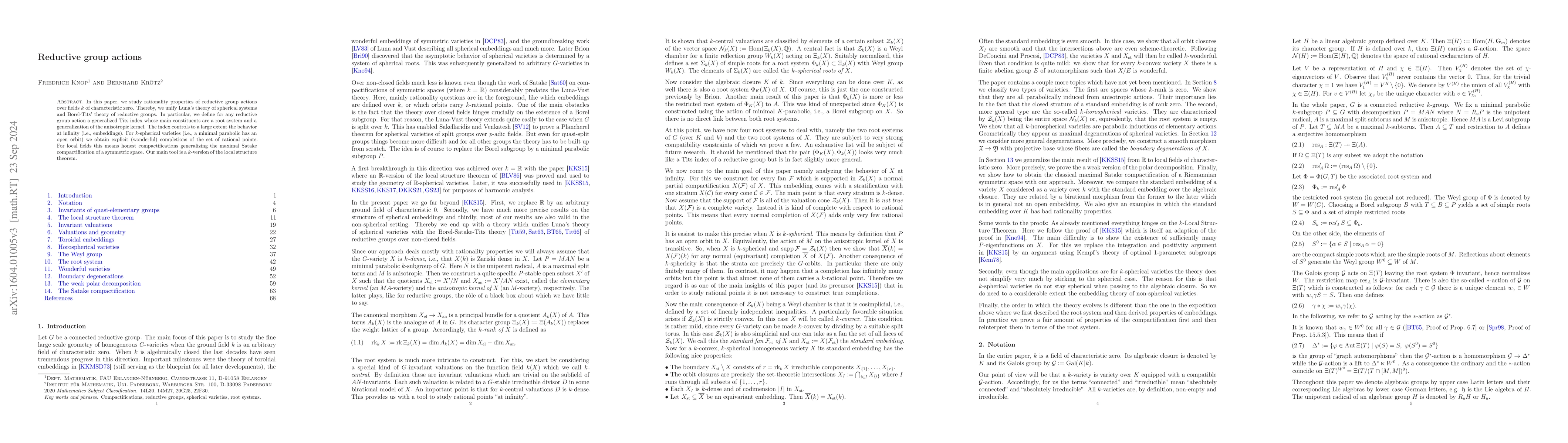 In this paper, we study rationality properties of reductive group actions which are defined over an arbitrary field of characteristic zero. Thereby, we unify Luna's theory of spherical systems and Borel-Tits' theory of reductive groups. In particular, we define for any reductive group action a generalized Tits index whose main constituents are a root system and a generalization of the anisotropic kernel. The index controls to a large extent the behavior at infinity (i.e., embeddings). For k-spherical varieties (i.e., where a minimal parabolic has an open orbit) we obtain explicit (wonderful) completions of the set of rational points. For local fields this means honest compactifications generalizing the maximal Satake compactification of a symmetric space. Our main tool is a k-version of the local structure theorem.