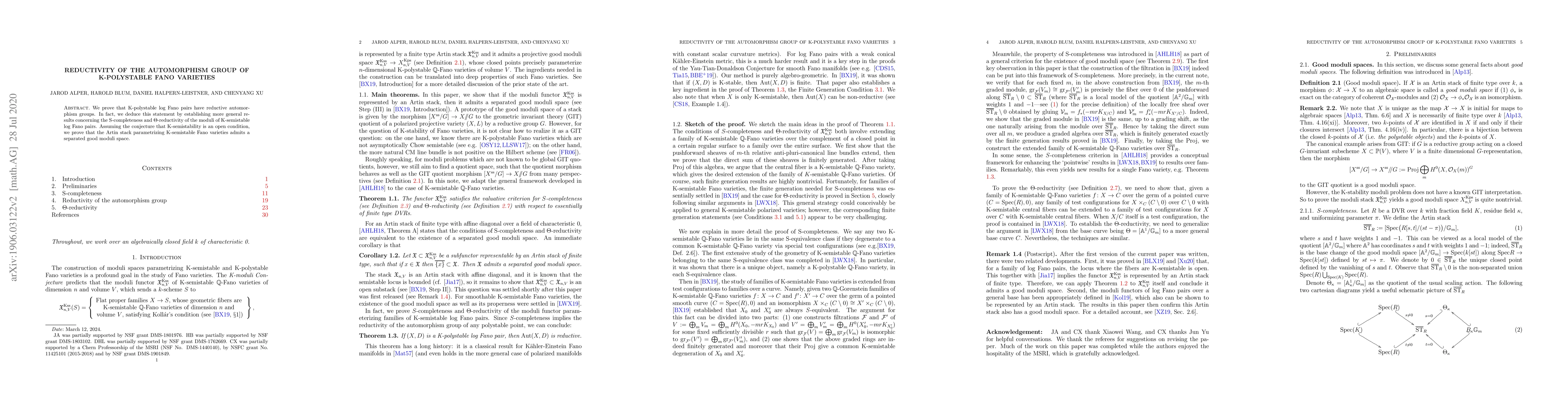 Summary: This paper proves that the automorphism group of K-polystable Fano varieties is reductive and establishes broader results on the S-completeness and $\Theta$-reductivity of moduli spaces for K-semistable log Fano pairs, assuming K-semistability is an open condition. It also demonstrates the existence of a separated good moduli space for the Artin stack of K-semistable Fano varieties.