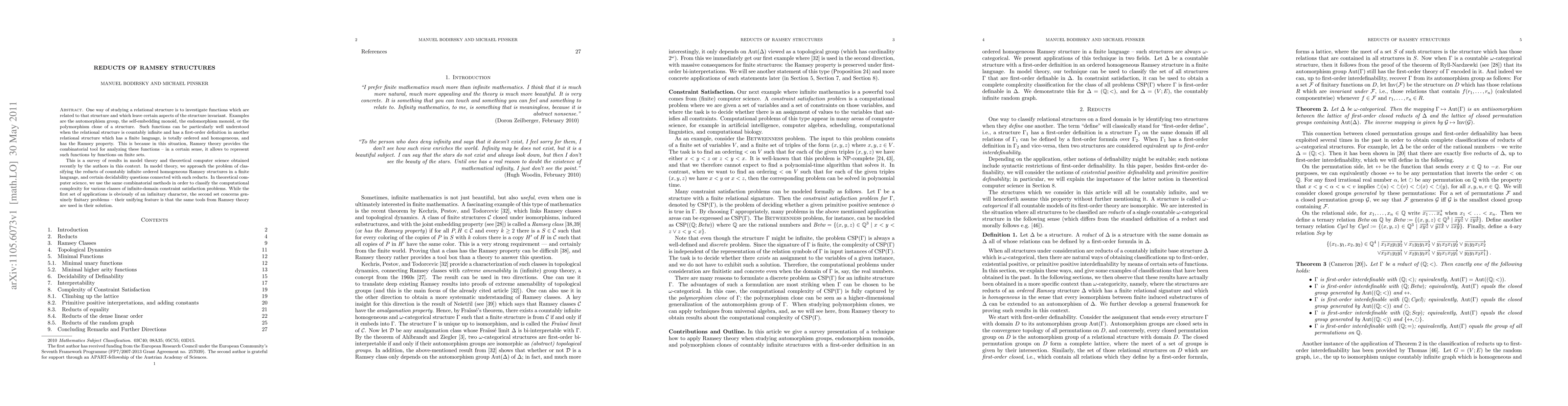 One way of studying a relational structure is to investigate functions which are related to that structure and which leave certain aspects of the structure invariant. Examples are the automorphism group, the self-embedding monoid, the endomorphism monoid, or the polymorphism clone of a structure. Such functions can be particularly well understood when the relational structure is countably infinite and has a first-order definition in another relational structure which has a finite language, is totally ordered and homogeneous, and has the Ramsey property. This is because in this situation, Ramsey theory provides the combinatorial tool for analyzing these functions -- in a certain sense, it allows to represent such functions by functions on finite sets. This is a survey of results in model theory and theoretical computer science obtained recently by the authors in this context. In model theory, we approach the problem of classifying the reducts of countably infinite ordered homogeneous Ramsey structures in a finite language, and certain decidability questions connected with such reducts. In theoretical computer science, we use the same combinatorial methods in order to classify the computational complexity for various classes of infinite-domain constraint satisfaction problems. While the first set of applications is obviously of an infinitary character, the second set concerns genuinely finitary problems -- their unifying feature is that the same tools from Ramsey theory are used in their solution.