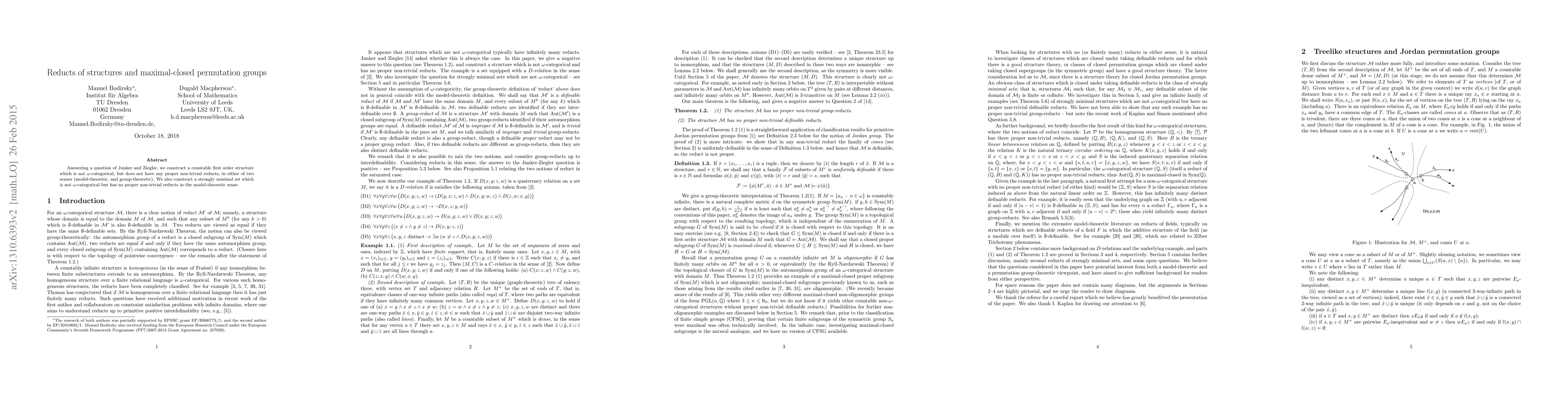 This paper constructs a countable first-order structure that is not omega-categorical but lacks any proper non-trivial reducts, addressing a question posed by Junker and Ziegler. Additionally, it presents a strongly minimal set that similarly lacks proper non-trivial model-theoretic reducts.
