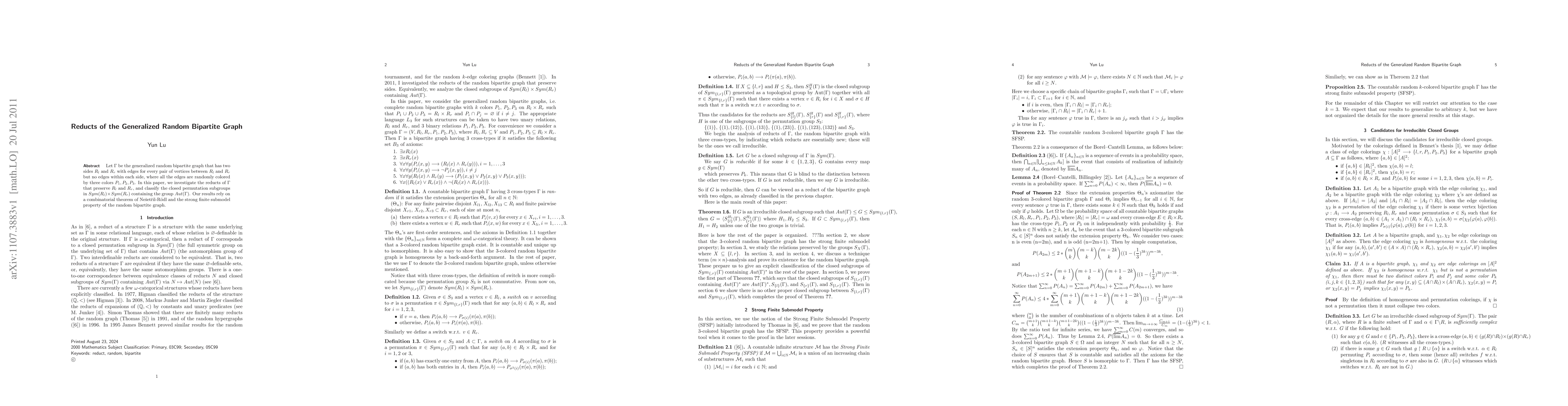 Let \Gamma be the generalized random bipartite graph that has two sides Rl and Rr with edges for every pair of vertices between R1 and Rr but no edges within each side, where all the edges are randomly colored by three colors P1; P2; P3. In this paper, we investigate the reducts of \Gamma that preserve Rl and Rr, and classify the closed permutation subgroups in Sym(Rl)\timesSym(Rr) containing the group Aut(\Gamma). Our results rely on a combinatorial theorem of Nesetril-Rodl and the strong finite submodel property of the random bipartite graph.