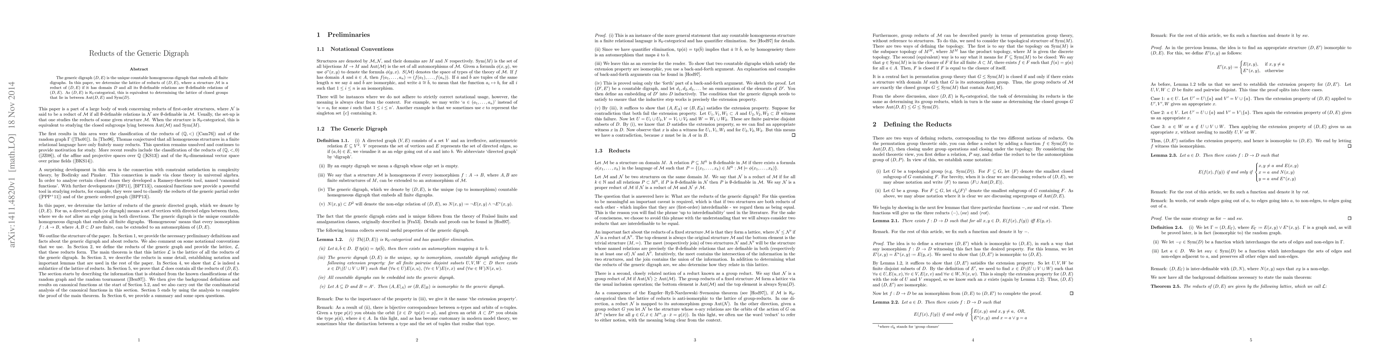 The generic digraph $(D,E)$ is the unique countable homogeneous digraph that embeds all finite digraphs. In this paper, we determine the lattice of reducts of $(D,E)$, where a structure $\mathcal{M}$ is a reduct of $(D,E)$ if it has domain $D$ and all its $\emptyset$-definable relations are $\emptyset$-definable relations of $(D,E)$. As $(D,E)$ is $\aleph_0$-categorical, this is equivalent to determining the lattice of closed groups that lie in between Aut$(D,E)$ and Sym$(D)$.