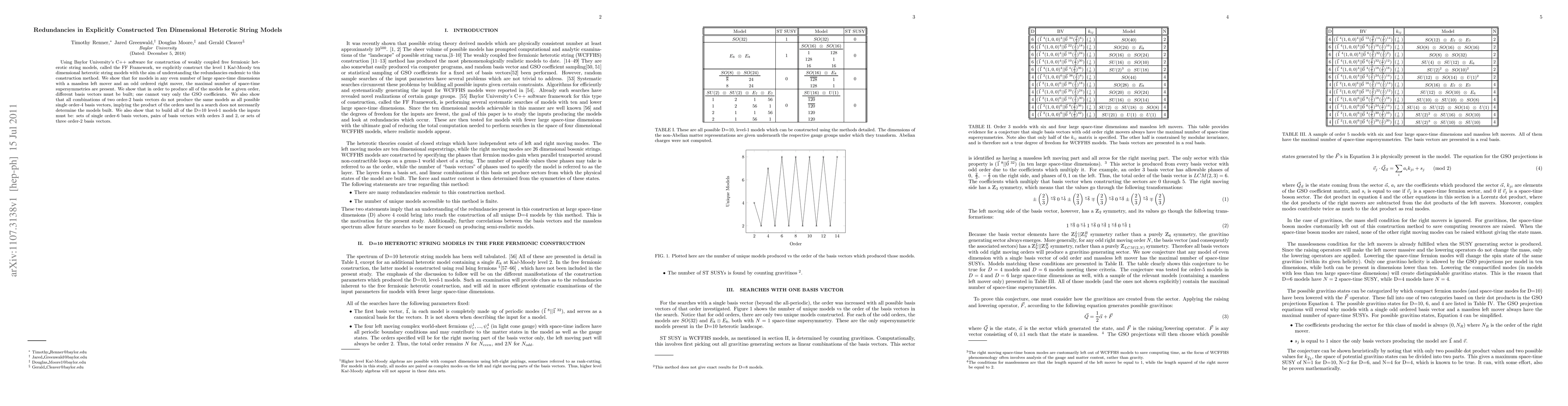 Using Baylor University's C++ software for construction of weakly coupled free fermionic heterotic string models, called the FF Framework, we explicitly construct the level 1 Ka\v{c}-Moody ten dimensional heterotic string models with the aim of understanding the redundancies endemic to this construction method. We show that for models in any even number of large space-time dimensions with a massless left mover and an odd ordered right mover, the maximal number of space-time supersymmetries are present. We show that in order to produce all of the models for a given order, different basis vectors must be built; one cannot vary only the GSO coefficients. We also show that all combinations of two order-2 basis vectors do not produce the same models as all possible single order-4 basis vectors, implying the product of the orders used in a search does not necessarily determine the models built. We also show that to build all of the D=10 level-1 models the inputs must be: sets of single order-6 basis vectors, pairs of basis vectors with orders 3 and 2, or sets of three order-2 basis vectors.