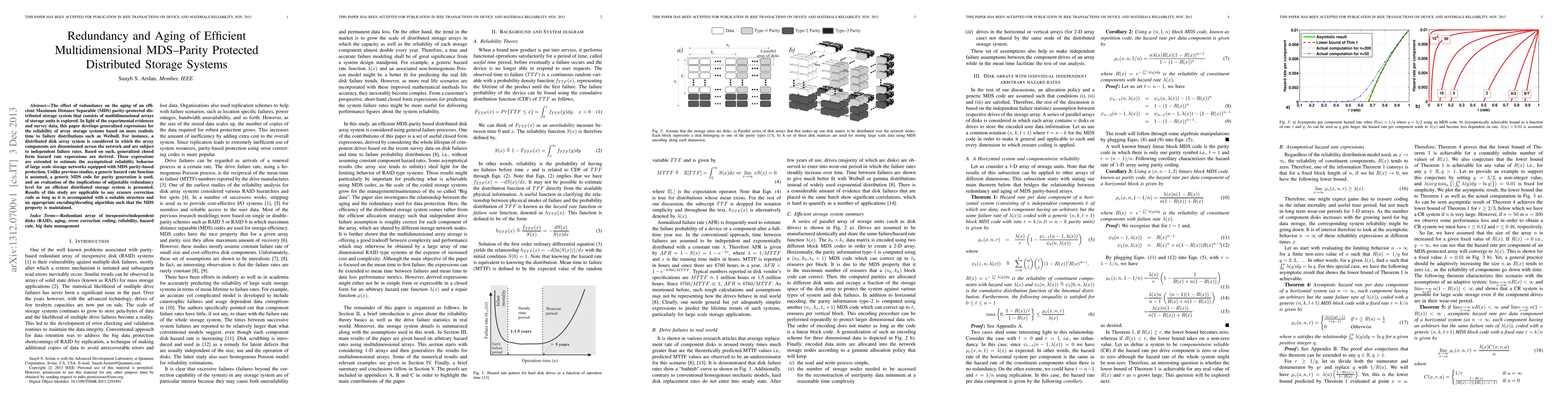 The effect of redundancy on the aging of an efficient Maximum Distance Separable (MDS) parity--protected distributed storage system that consists of multidimensional arrays of storage units is explored. In light of the experimental evidences and survey data, this paper develops generalized expressions for the reliability of array storage systems based on more realistic time to failure distributions such as Weibull. For instance, a distributed disk array system is considered in which the array components are disseminated across the network and are subject to independent failure rates. Based on such, generalized closed form hazard rate expressions are derived. These expressions are extended to estimate the asymptotical reliability behavior of large scale storage networks equipped with MDS parity-based protection. Unlike previous studies, a generic hazard rate function is assumed, a generic MDS code for parity generation is used, and an evaluation of the implications of adjustable redundancy level for an efficient distributed storage system is presented. Results of this study are applicable to any erasure correction code as long as it is accompanied with a suitable structure and an appropriate encoding/decoding algorithm such that the MDS property is maintained.