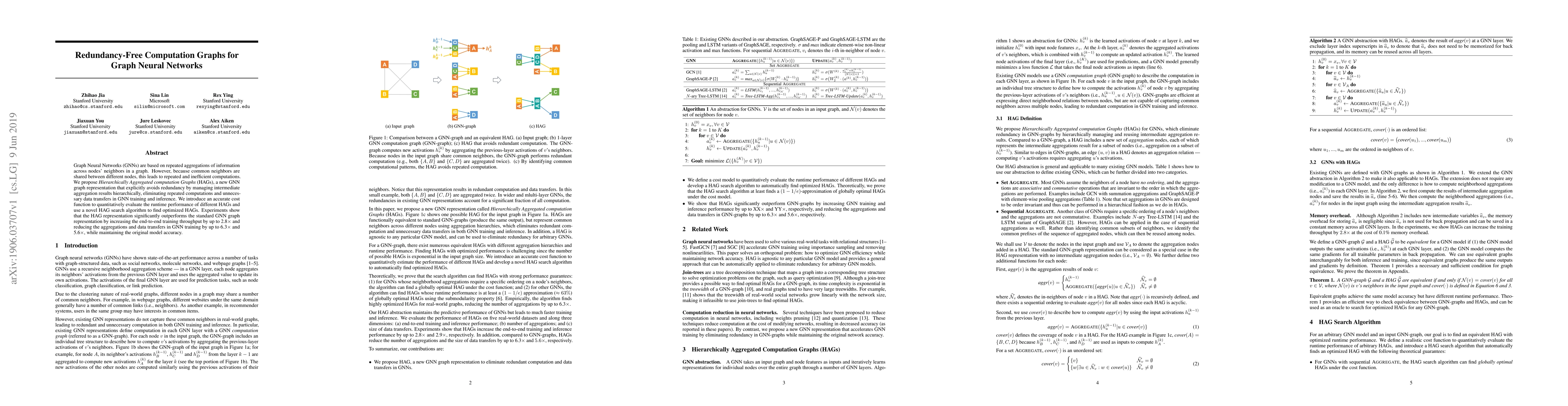 This paper proposes Hierarchically Aggregated computation Graphs (HAGs) to eliminate redundancy in Graph Neural Networks (GNNs), significantly improving training throughput and reducing unnecessary computations. The HAG representation achieves up to 2.8x faster training and cuts aggregations and data transfers by up to 6.3x and 5.6x, respectively, without compromising model accuracy.