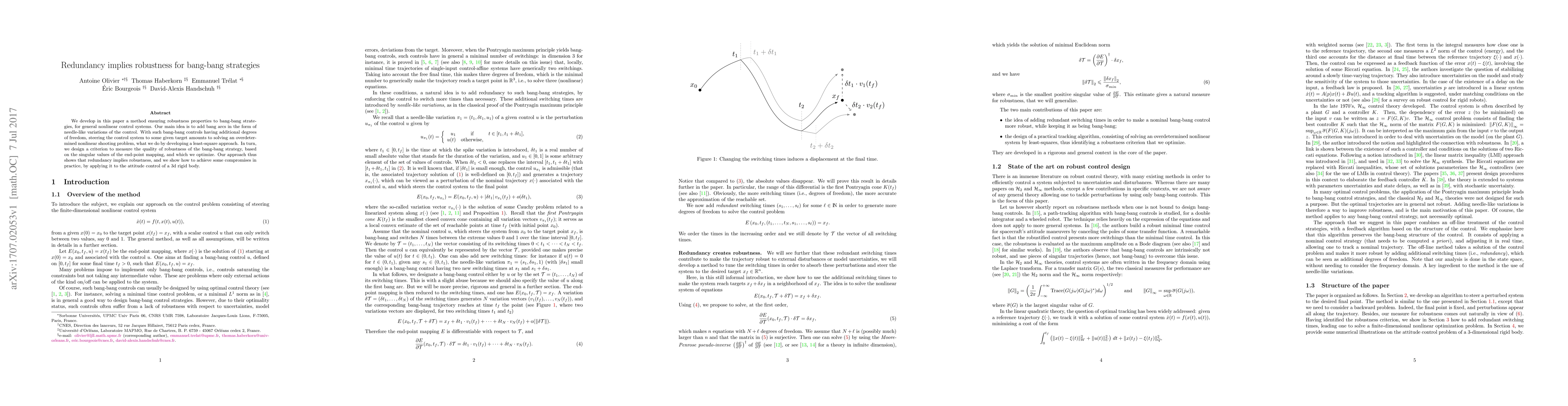 We develop in this paper a method ensuring robustness properties to bang-bang strategies , for general nonlinear control systems. Our main idea is to add bang arcs in the form of needle-like variations of the control. With such bang-bang controls having additional degrees of freedom, steering the control system to some given target amounts to solving an overdeter-mined nonlinear shooting problem, what we do by developing a least-square approach. In turn, we design a criterion to measure the quality of robustness of the bang-bang strategy, based on the singular values of the end-point mapping, and which we optimize. Our approach thus shows that redundancy implies robustness, and we show how to achieve some compromises in practice, by applying it to the attitude control of a 3d rigid body.