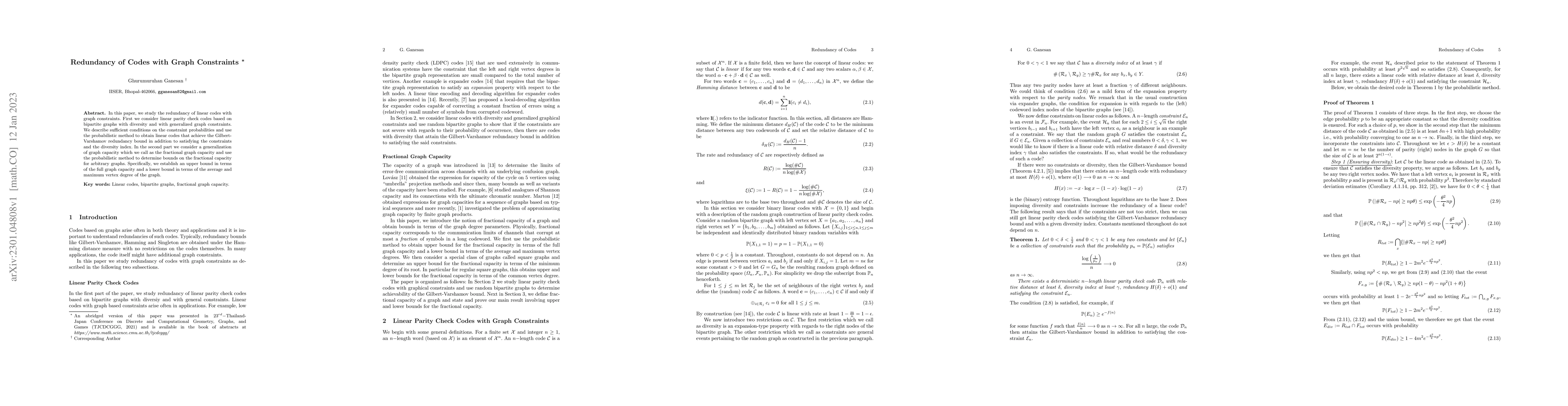 In this paper, we study the redundancy of linear codes with graph constraints. First we consider linear parity check codes based on bipartite graphs with diversity and with generalized graph constraints. We describe sufficient conditions on the constraint probabilities and use the probabilistic method to obtain linear codes that achieve the Gilbert-Varshamov redundancy bound in addition to satisfying the constraints and the diversity index. In the second part we consider a generalization of graph capacity which we call as the fractional graph capacity and use the probabilistic method to determine bounds on the fractional capacity for arbitrary graphs. Specifically, we establish an upper bound in terms of the full graph capacity and a lower bound in terms of the average and maximum vertex degree of the graph.