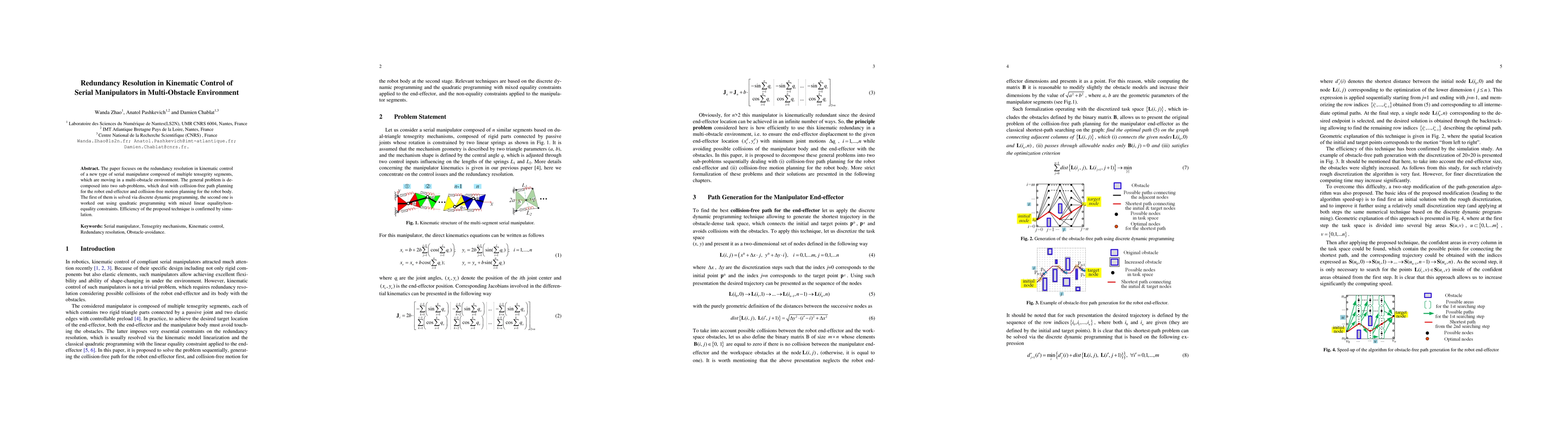 The paper focuses on the redundancy resolution in kinematic control of a new type of serial manipulator composed of multiple tensegrity segments, which are moving in a multi-obstacle environment. The general problem is decomposed into two sub-problems, which deal with collision-free path planning for the robot end-effector and collision-free motion planning for the robot body. The first of them is solved via discrete dynamic programming, the second one is worked out using quadratic programming with mixed linear equality/nonequality constraints. Efficiency of the proposed technique is confirmed by simulation.