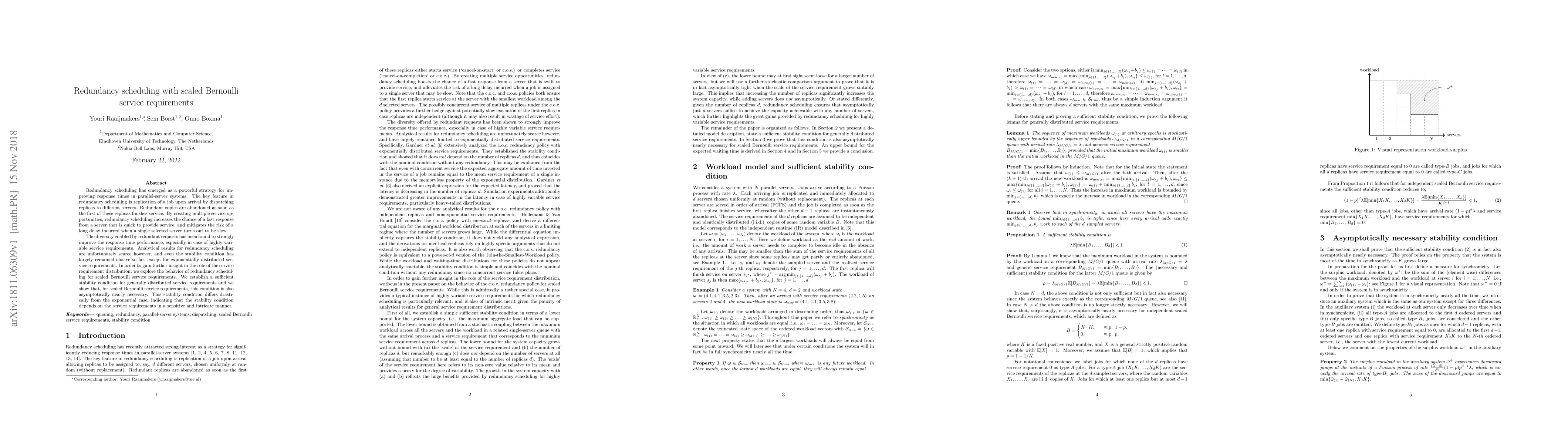 Redundancy scheduling has emerged as a powerful strategy for improving response times in parallel-server systems. The key feature in redundancy scheduling is replication of a job upon arrival by dispatching replicas to different servers. Redundant copies are abandoned as soon as the first of these replicas finishes service. By creating multiple service opportunities, redundancy scheduling increases the chance of a fast response from a server that is quick to provide service, and mitigates the risk of a long delay incurred when a single selected server turns out to be slow. The diversity enabled by redundant requests has been found to strongly improve the response time performance, especially in case of highly variable service requirements. Analytical results for redundancy scheduling are unfortunately scarce however, and even the stability condition has largely remained elusive so far, except for exponentially distributed service requirements. In order to gain further insight in the role of the service requirement distribution, we explore the behavior of redundancy scheduling for scaled Bernoulli service requirements. We establish a sufficient stability condition for generally distributed service requirements and we show that, for scaled Bernoulli service requirements, this condition is also asymptotically nearly necessary. This stability condition differs drastically from the exponential case, indicating that the stability condition depends on the service requirements in a sensitive and intricate manner.