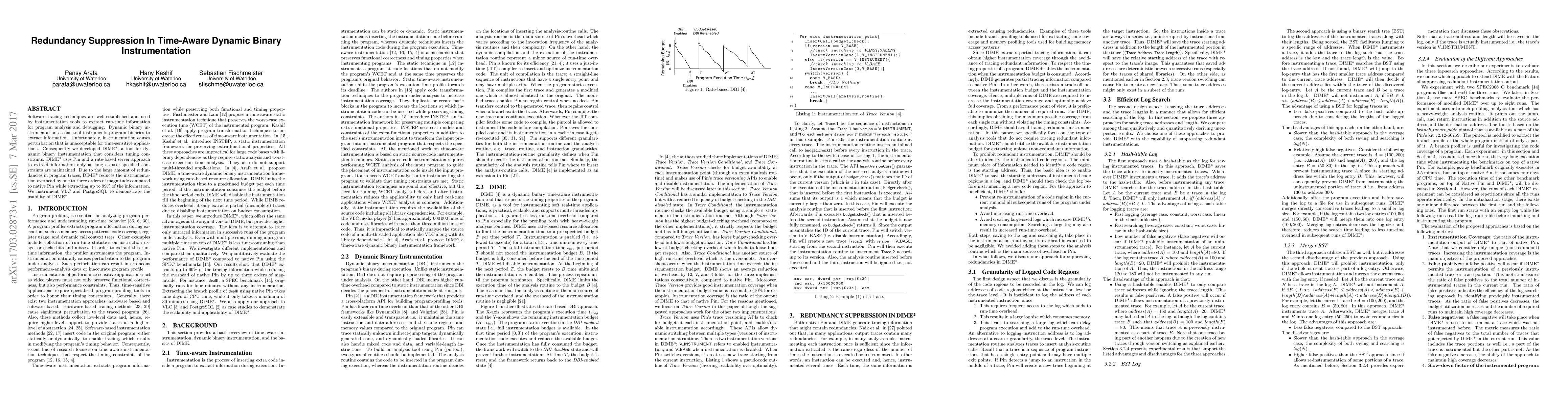 DIME* is a tool for dynamic binary instrumentation that minimizes timing perturbations for time-sensitive applications, reducing redundancy in program traces by one to three orders of magnitude compared to native Pin while retaining up to 99% of the extracted information. It demonstrates effectiveness through instrumentation of VLC and PostgreSQL.
