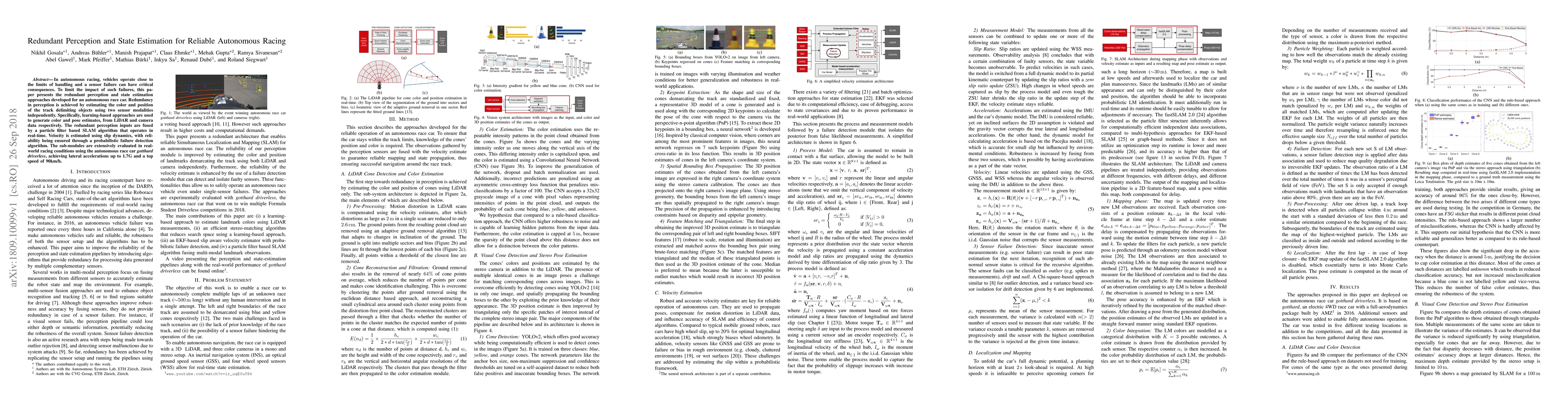 In autonomous racing, vehicles operate close to the limits of handling and a sensor failure can have critical consequences. To limit the impact of such failures, this paper presents the redundant perception and state estimation approaches developed for an autonomous race car. Redundancy in perception is achieved by estimating the color and position of the track delimiting objects using two sensor modalities independently. Specifically, learning-based approaches are used to generate color and pose estimates, from LiDAR and camera data respectively. The redundant perception inputs are fused by a particle filter based SLAM algorithm that operates in real-time. Velocity is estimated using slip dynamics, with reliability being ensured through a probabilistic failure detection algorithm. The sub-modules are extensively evaluated in real-world racing conditions using the autonomous race car "gotthard driverless", achieving lateral accelerations up to 1.7G and a top speed of 90km/h.
