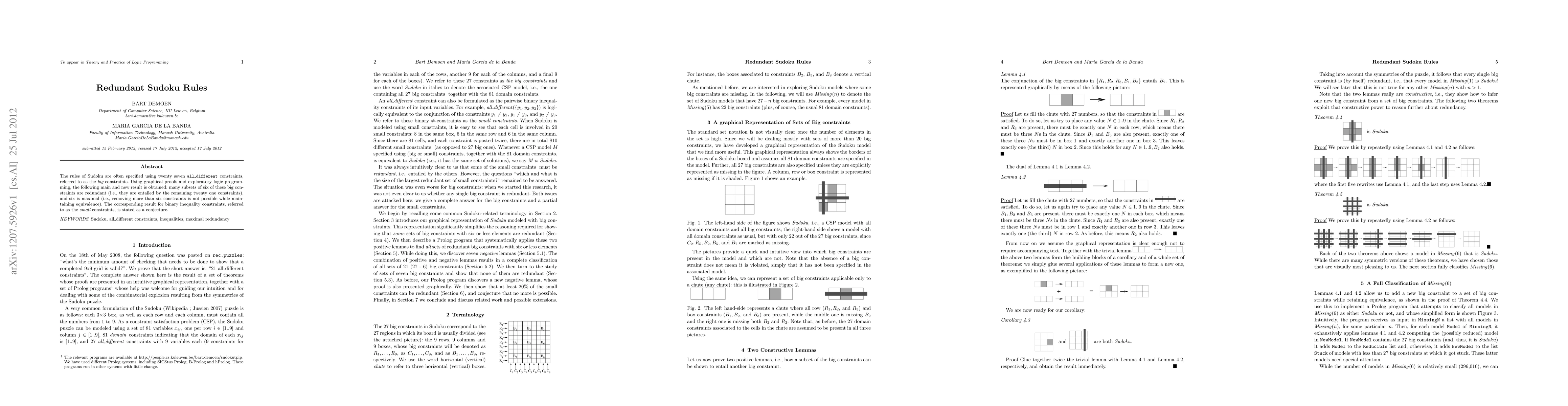 The rules of Sudoku are often specified using twenty seven \texttt{all\_different} constraints, referred to as the {\em big} \mrules. Using graphical proofs and exploratory logic programming, the following main and new result is obtained: many subsets of six of these big \mrules are redundant (i.e., they are entailed by the remaining twenty one \mrules), and six is maximal (i.e., removing more than six \mrules is not possible while maintaining equivalence). The corresponding result for binary inequality constraints, referred to as the {\em small} \mrules, is stated as a conjecture.