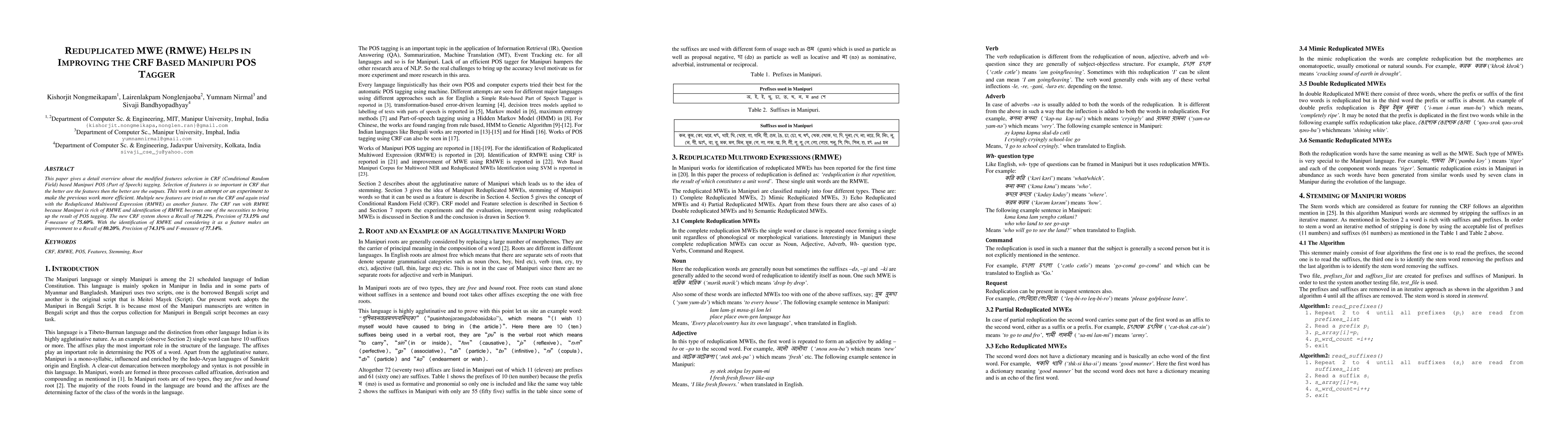 This paper improves a CRF-based Manipuri POS tagger by incorporating Reduplicated Multiword Expression (RMWE) features, achieving higher recall and F-measure.