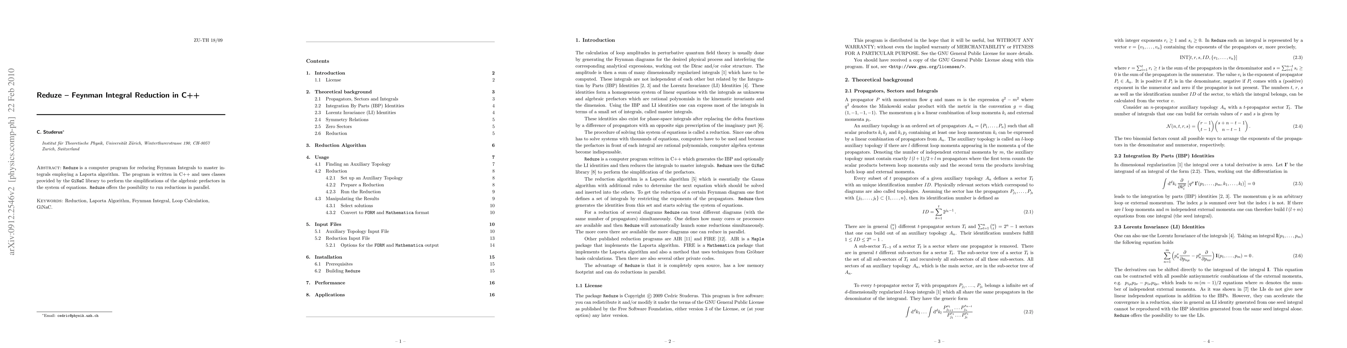 Reduze is a C++ program designed to reduce Feynman integrals to master integrals using Laporta's algorithm, leveraging GiNaC for algebraic simplifications. It supports parallel reductions for enhanced computational efficiency.