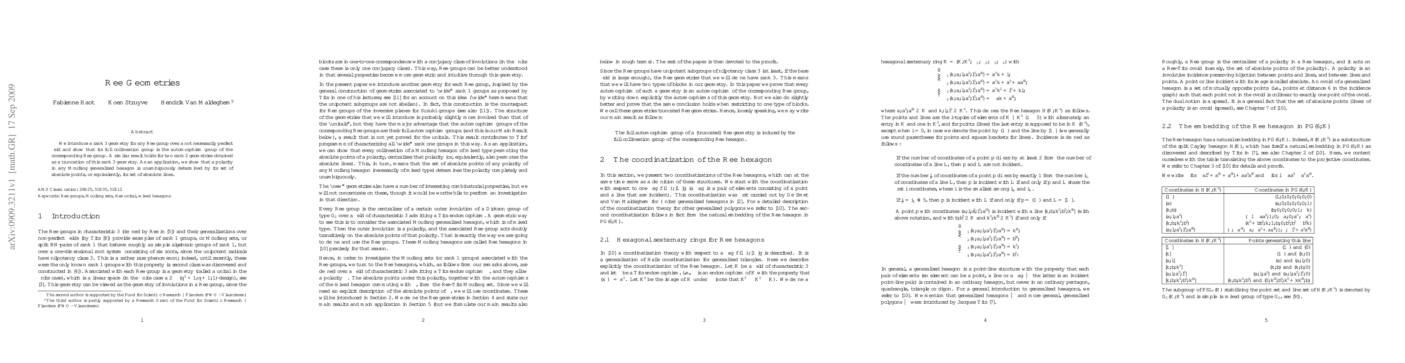 We introduce a rank 3 geometry for any Ree group over a not necessarily perfect field and show that its full collineation group is the automorphism group of the corresponding Ree group. A similar result holds for two rank 2 geometries obtained as a truncation of this rank 3 geometry. As an application, we show that a polarity in any Moufang generalized hexagon is unambiguously determined by its set of absolute points, or equivalently, its set of absolute lines.
