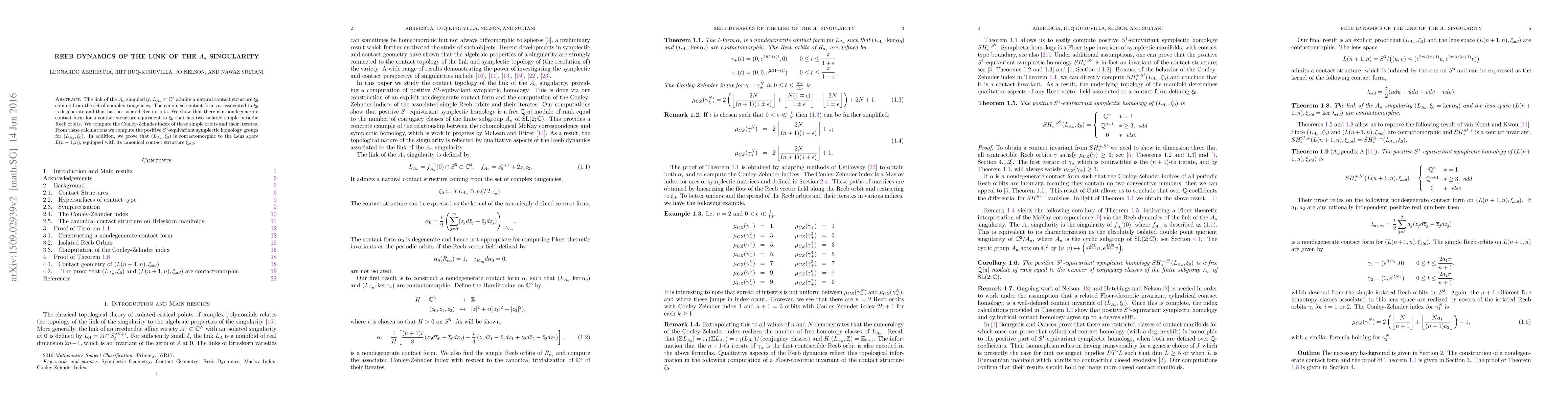 The link of the $A_n$ singularity, $L_{A_n} \subset \mathbb{C}^3$ admits a natural contact structure $\xi_0$ coming from the set of complex tangencies. The canonical contact form $\alpha_0$ associated to $\xi_0$ is degenerate and thus has no isolated Reeb orbits. We show that there is a nondegenerate contact form for a contact structure equivalent to $\xi_0$ that has two isolated simple periodic Reeb orbits. We compute the Conley-Zehnder index of these simple orbits and their iterates. From these calculations we compute the positive $S^1$-equivariant symplectic homology groups for $\left(L_{A_n}, \xi_0 \right)$. In addition, we prove that $\left(L_{A_n}, \xi_0 \right)$ is contactomorphic to the Lens space $L(n+1,n)$, equipped with its canonical contact structure $\xi_{std}$.