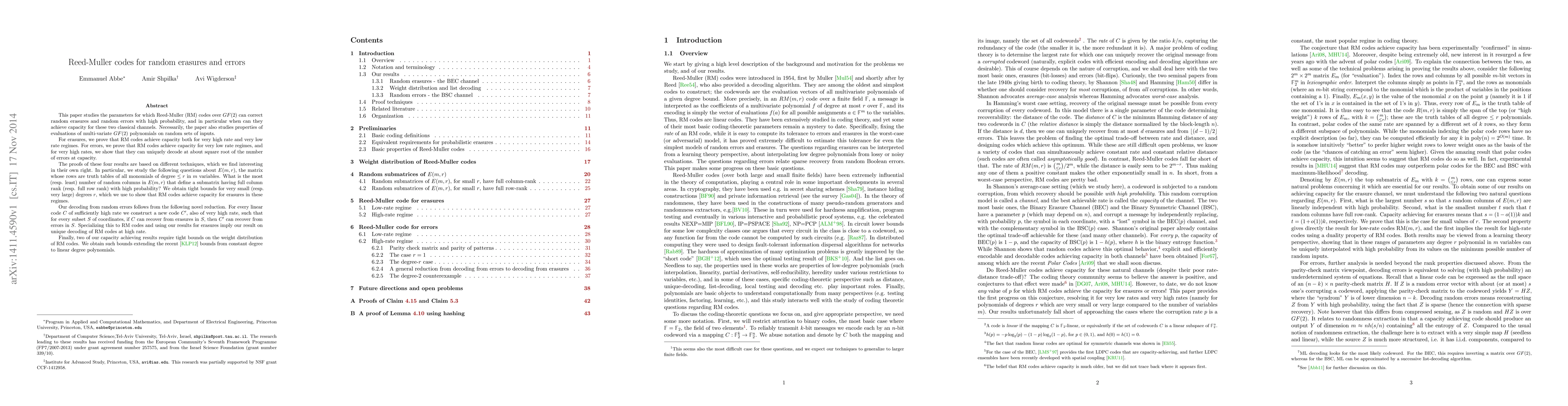 The paper presents novel techniques for proving capacity-achieving results for Reed-Muller codes under random erasures and errors, along with improved bounds on the weight distribution of these codes.