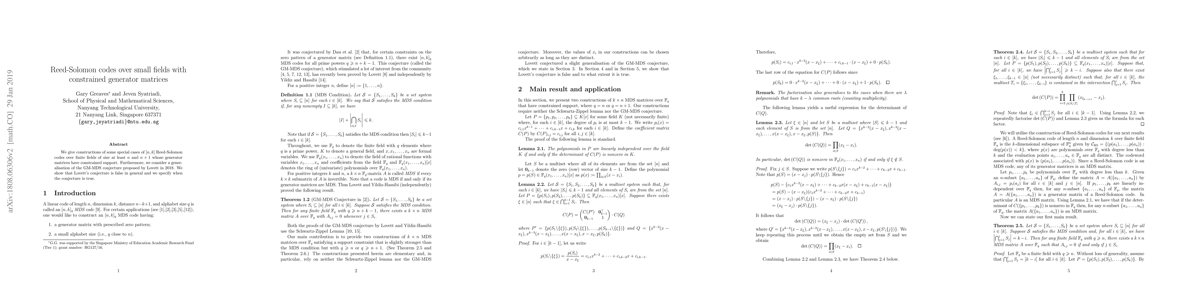 This paper constructs special Reed-Solomon codes over small finite fields with constrained generator matrices and disproves a generalisation of the GM-MDS conjecture proposed by Lovett, identifying specific conditions under which the conjecture holds true.