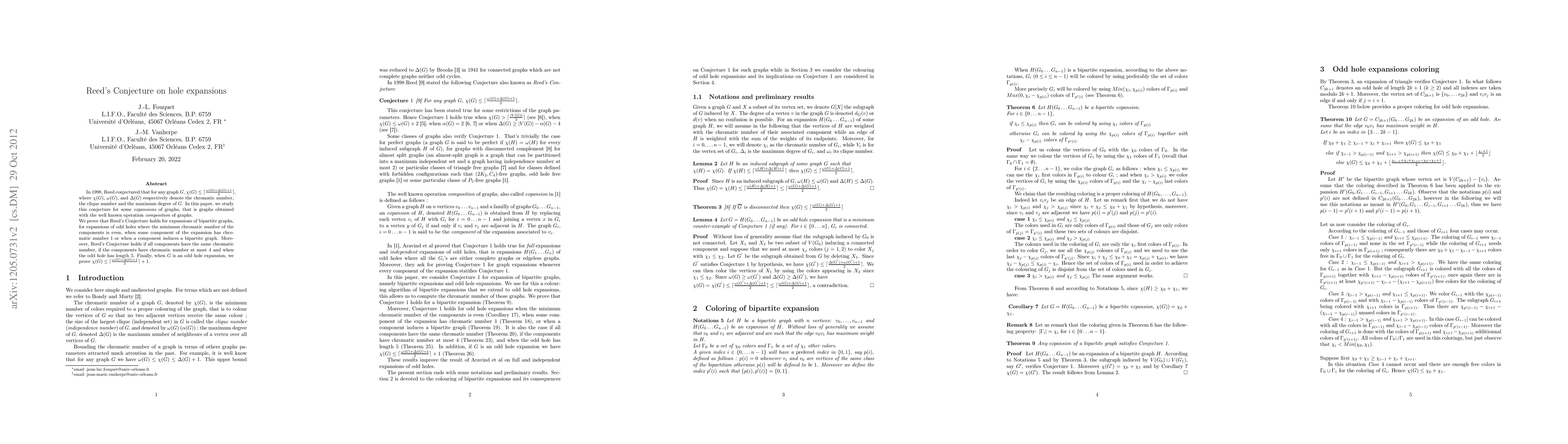 Researchers prove Reed's Conjecture holds for certain types of graph expansions, including bipartite graphs, odd hole expansions with specific conditions, and when components have the same chromatic number or a maximum degree of 4.