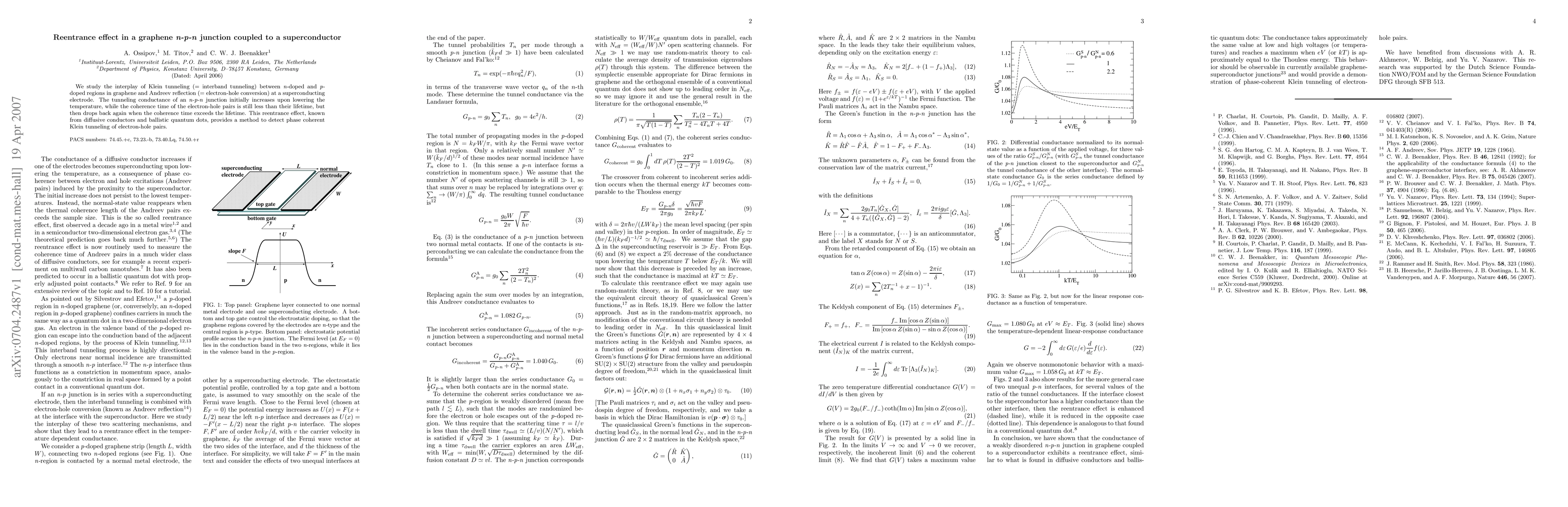 This paper investigates the reentrance effect in graphene's n-p-n junction coupled with a superconductor, revealing an initial increase in tunneling conductance followed by a drop when coherence time surpasses the lifetime, demonstrating phase coherent Klein tunneling via Andreev reflection.