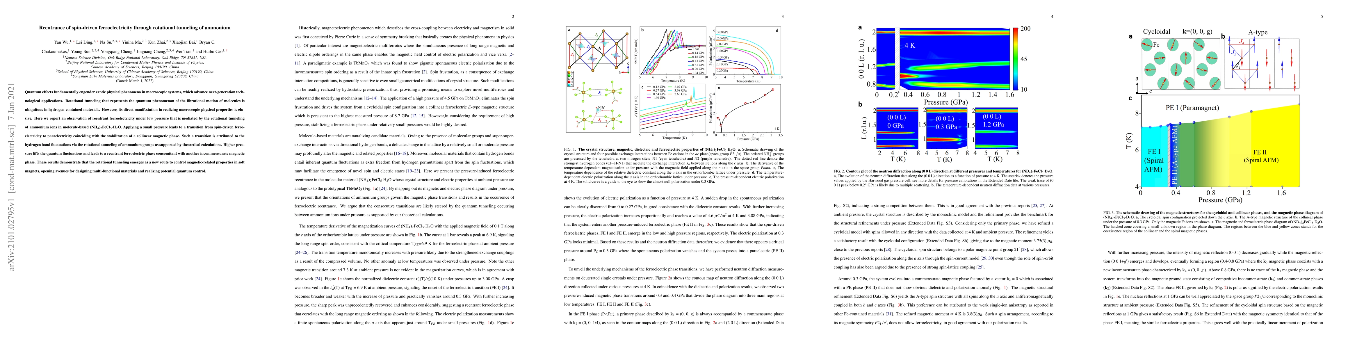 Quantum effects fundamentally engender exotic physical phenomena in macroscopic systems, which advance next-generation technological applications. Rotational tunneling that represents the quantum phenomenon of the librational motion of molecules is ubiquitous in hydrogen-contained materials. However, its direct manifestation in realizing macroscopic physical properties is elusive. Here we report an observation of reentrant ferroelectricity under low pressure that is mediated by the rotational tunneling of ammonium ions in molecule-based (NH$_4$)$_2$FeCl$_5 \cdot$H$_2$O. Applying a small pressure leads to a transition from spin-driven ferroelectricity to paraelectricity coinciding with the stabilization of a collinear magnetic phase. Such a transition is attributed to the hydrogen bond fluctuations via the rotational tunneling of ammonium groups as supported by theoretical calculations. Higher pressure lifts the quantum fluctuations and leads to a reentrant ferroelectric phase concomitant with another incommensurate magnetic phase. These results demonstrate that the rotational tunneling emerges as a new route to control magnetic-related properties in soft magnets, opening avenues for designing multi-functional materials and realizing potential quantum control.