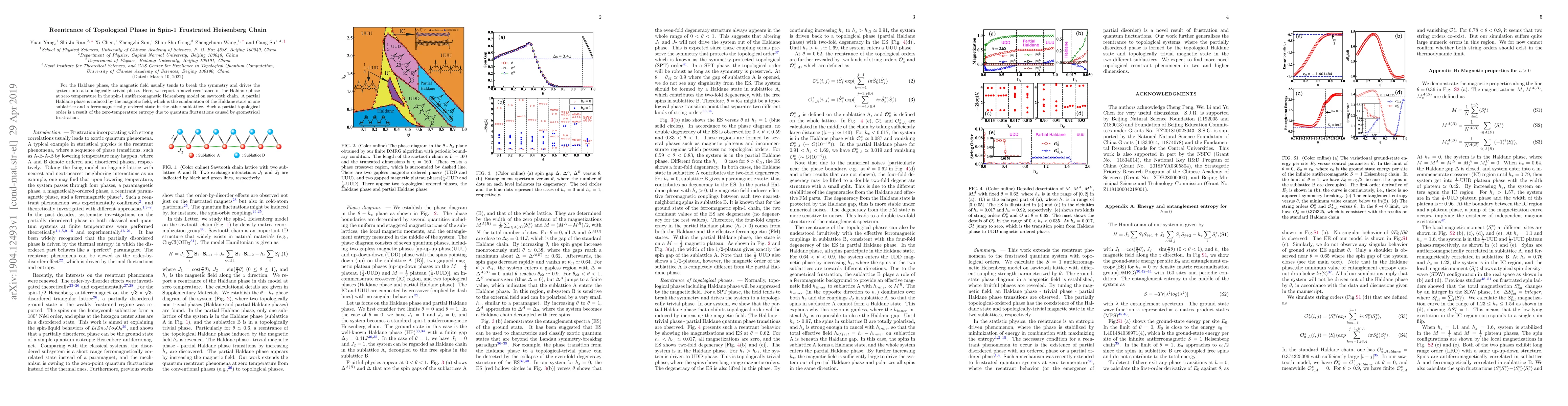For the Haldane phase, the magnetic field usually tends to break the symmetry and drives the system into a topologically trivial phase. Here, we report a novel reentrance of the Haldane phase at zero temperature in the spin-1 antiferromagnetic Heisenberg model on sawtooth chain. A partial Haldane phase is induced by the magnetic field, which is the combination of the Haldane state in one sublattice and a ferromagnetically ordered state in the other sublattice. Such a partial topological order is a result of the zero-temperature entropy due to quantum fluctuations caused by geometrical frustration.