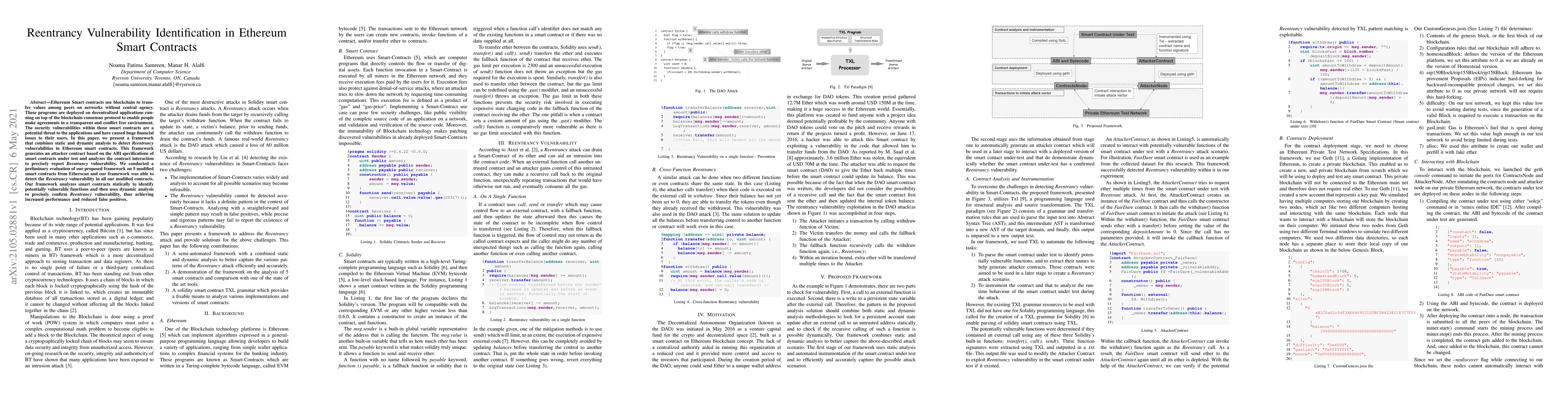 This paper introduces a framework combining static and dynamic analysis to detect Reentrancy vulnerabilities in Ethereum smart contracts, successfully identifying such vulnerabilities in 5 modified contracts from Etherscan. The framework enhances performance and reduces false positives by first statically identifying potentially vulnerable functions and then confirming vulnerabilities through dynamic analysis.
