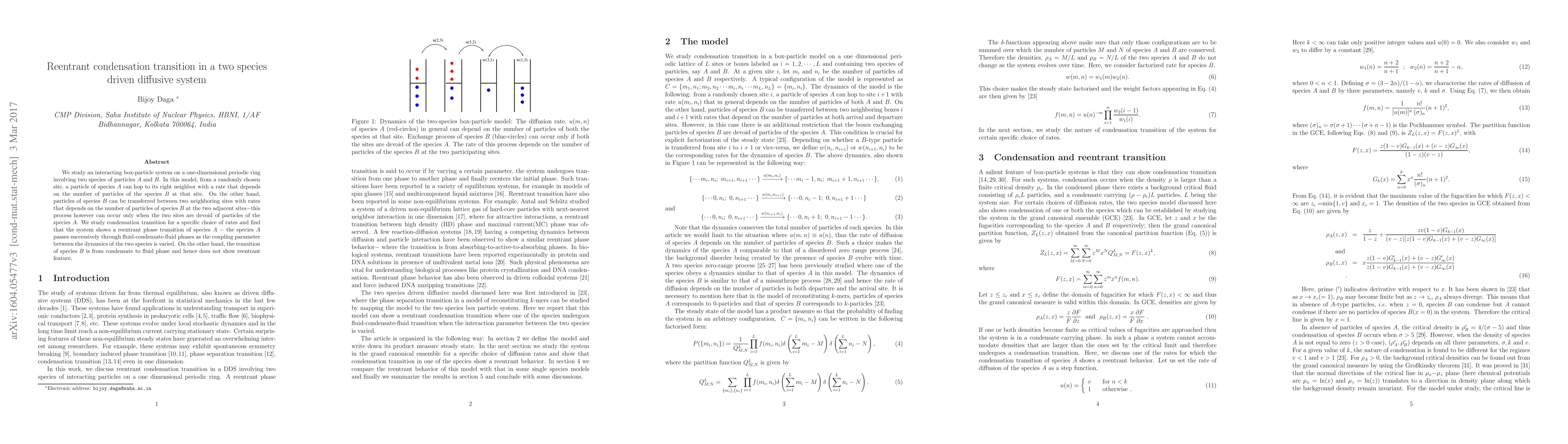 This paper investigates a two-species driven diffusive system on a one-dimensional ring, finding that species $A$ exhibits a reentrant condensation transition, cycling through fluid-condensate-fluid phases, while species $B$ transitions from condensate to fluid without reentry.