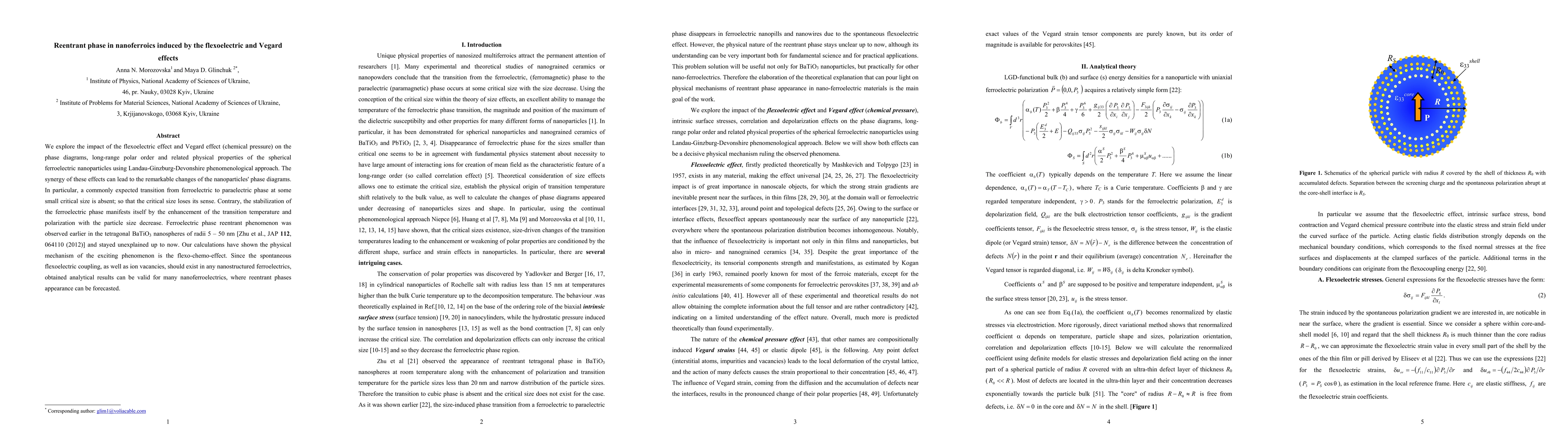 This paper investigates the flexoelectric and Vegard effects on the phase diagrams and properties of spherical ferroelectric nanoparticles, revealing that these effects can stabilize the ferroelectric phase and lead to a reentrant phase phenomenon, contrary to the expected transition to paraelectric. The flexo-chemo-effect is identified as the underlying mechanism for this reentrant behavior, applicable to various nanoferroelectrics.