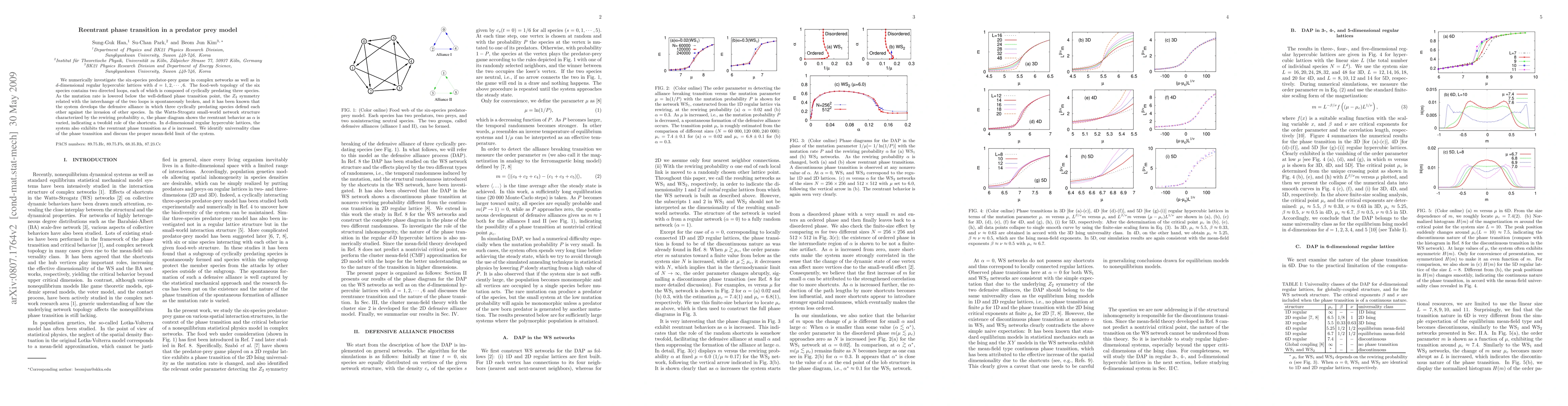 This paper investigates a six-species predator-prey model showing a reentrant phase transition in both complex networks and hypercubic lattices. The system exhibits a defensive alliance formation upon lowering the mutation rate, with a reentrant behavior observed in small-world networks and higher-dimensional lattices.