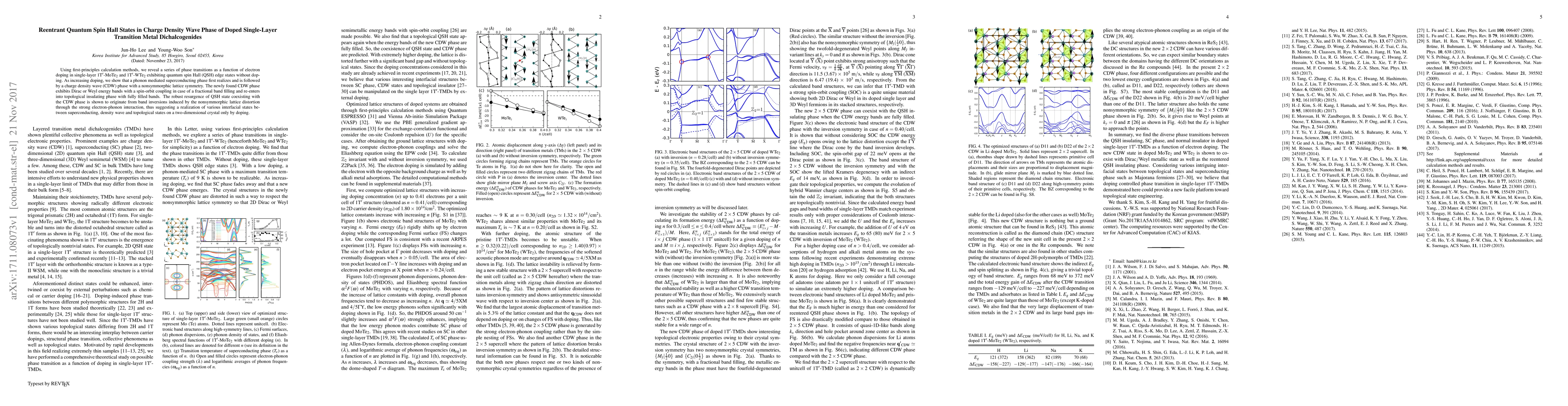 This research, using first-principles calculations, discovers a series of phase transitions in doped single-layer 1T'-MoTe2 and 1T'-WTe2. These materials exhibit quantum spin Hall (QSH) edge states, superconductivity, and a charge density wave (CDW) phase with nonsymmorphic lattice symmetry. The CDW phase, arising from band inversions due to electron-phonon interaction, re-enters a topological insulating phase, suggesting a platform for various interfacial states between superconducting, density wave, and topological states in doped 2D crystals.
