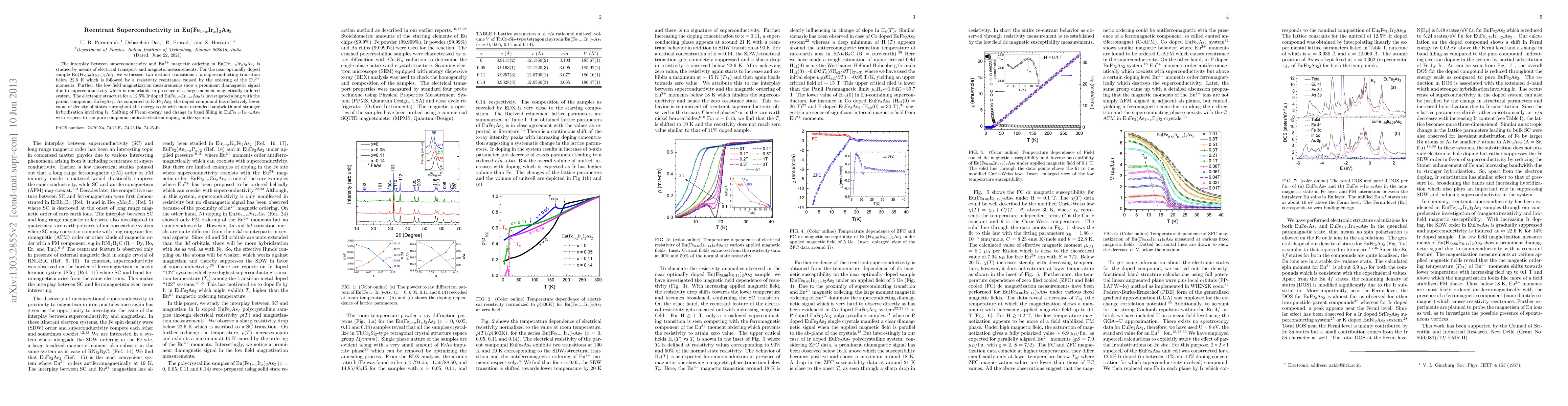 The interplay between superconductivity and Eu$^{2+}$ magnetic ordering in Eu(Fe$_{1-x}$Ir$_{x}$)$_{2}$As$_{2}$ is studied by means of electrical transport and magnetic measurements. For the critically doped sample Eu(Fe$_{0.86}$Ir$_{0.14}$)$_{2}$As$_{2}$, we witnessed two distinct transitions : a superconducting transition below 22.6 K which is followed by a resistivity reentrance caused by the ordering of the Eu$^{2+}$ moments. Further, the low field magnetization measurements show a prominent diamagnetic signal due to superconductivity which is remarkable in presence of a large moment magnetically ordered system. The electronic structure for a 12.5% Ir doped EuFe$_{1.75}$Ir$_{0.25}$As$_{2}$ is investigated along with the parent compound EuFe$_{2}$As$_{2}$. As compared to EuFe$_{2}$As$_{2}$, the doped compound has effectively lower value of density of states throughout the energy scale with more extended bandwidth and stronger hybridization involving Ir. Shifting of Fermi energy and change in band filling in EuFe$_{1.75}$Ir$_{0.25}$As$_{2}$ with respect to the pure compound indicate electron doping in the system.