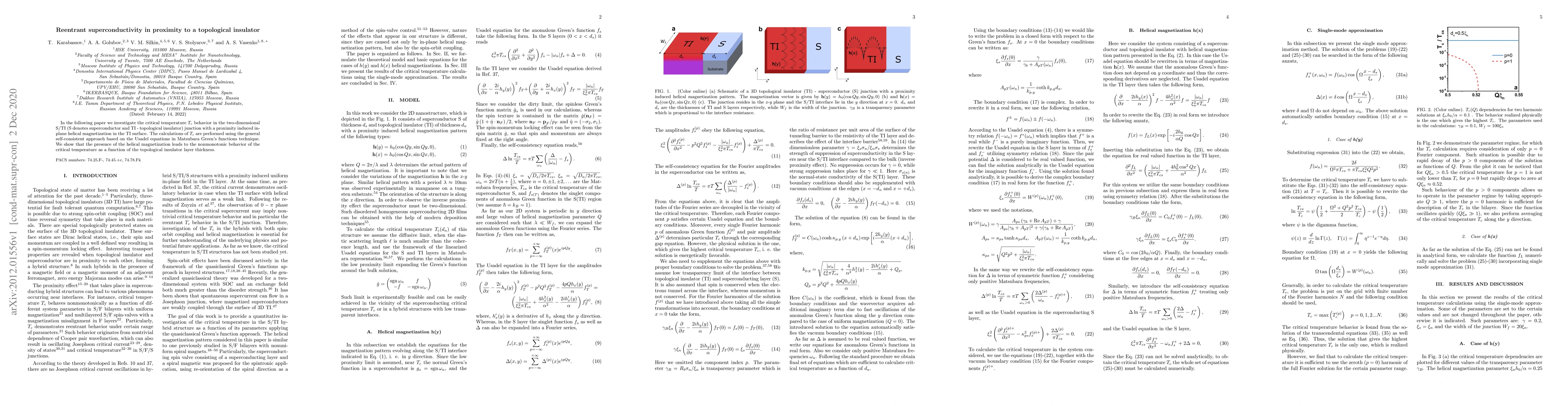 In the following paper we investigate the critical temperature $T_c$ behavior in the two-dimensional S/TI (S denotes superconductor and TI - topological insulator) junction with a proximity induced in-plane helical magnetization in the TI surface. The calculations of $T_c$ are performed using the general self-consistent approach based on the Usadel equations in Matsubara Green's functions technique. We show that the presence of the helical magnetization leads to the nonmonotonic behavior of the critical temperature as a function of the topological insulator layer thickness.