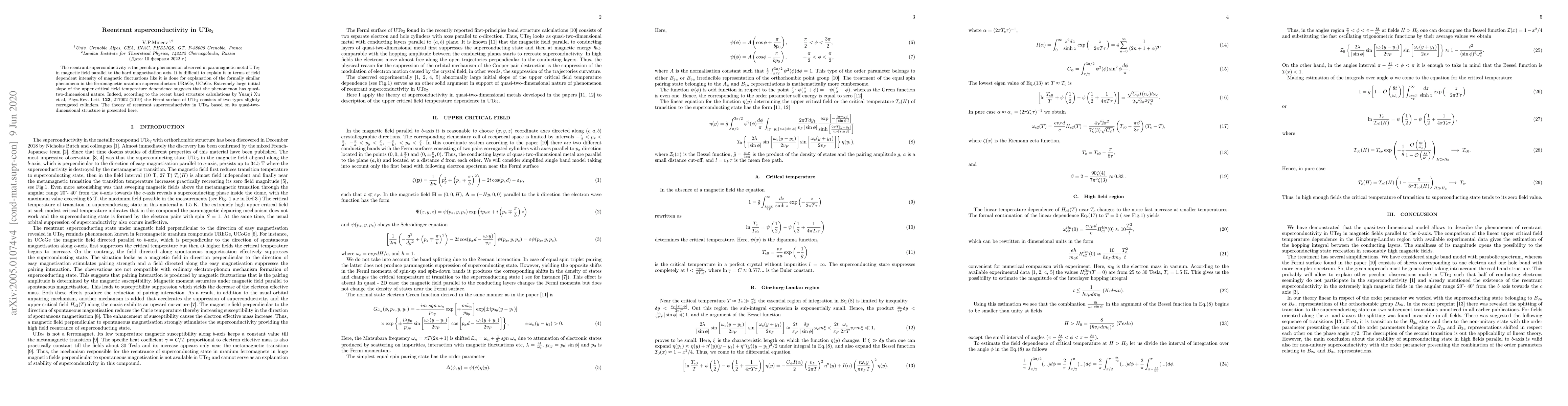 The reentrant superconductivity is the peculiar phenomenon observed in paramagnetic metal UTe$_2$ in magnetic field parallel to the hard magnetisation axis. It is difficult to explain it in terms of field dependent intensity of magnetic fluctuations like it is done for explanation of the formally similar phenomena in the ferromagnetic uranium superconductors URhGe, UCoGe. Extremely large initial slope of the upper critical field temperature dependence suggests that the phenomenon has the quasi-two-dimensional nature. Indeed, according to the recent band structure calculations by Yuanji Xu et al, Phys.Rev. Lett. {\bf 123}, 217002 (2019) the Fermi surface of UTe$_2$ consists of two types slightly corrugated cylinders.The theory of reentrant superconductivity in UTe$_2$ based on its quasi-two-dimensional structure is presented here.